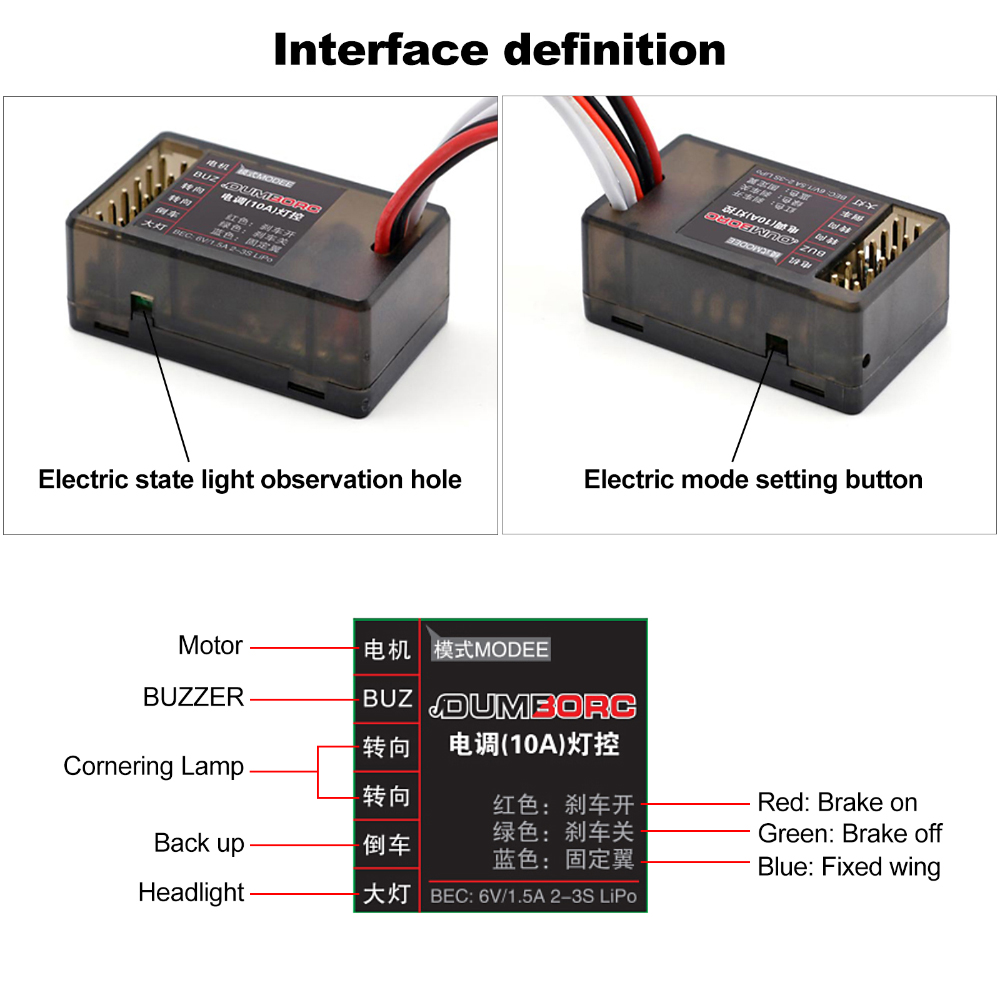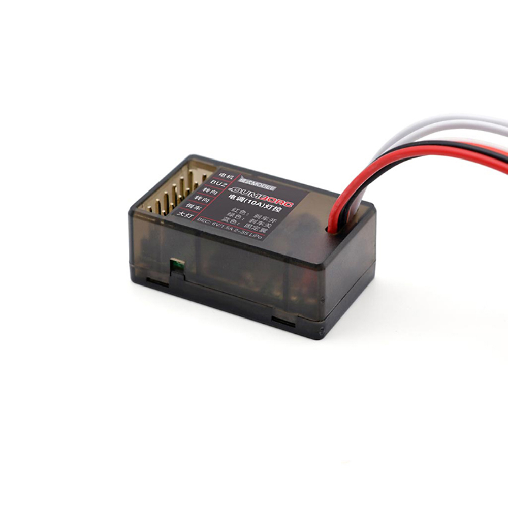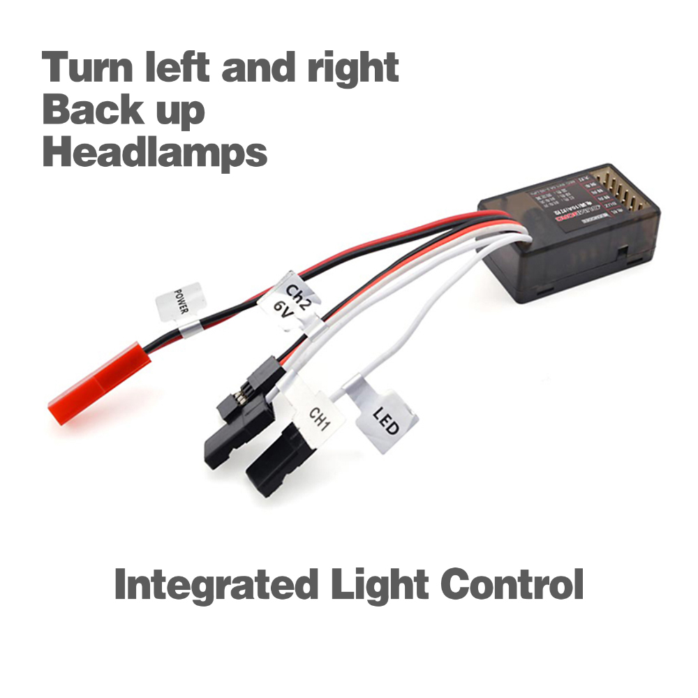 Welcome to use our two in one electric regulator. This electric regulator integrates light control, which can realize left and right turning, reversing and headlamp effect, and meet the basic needs of lamp modification. It does not need to purchase additional separate modules, which can save the interior space of the model car. It only needs to insert the lamp into the corresponding needle, reducing the trouble of wiring.