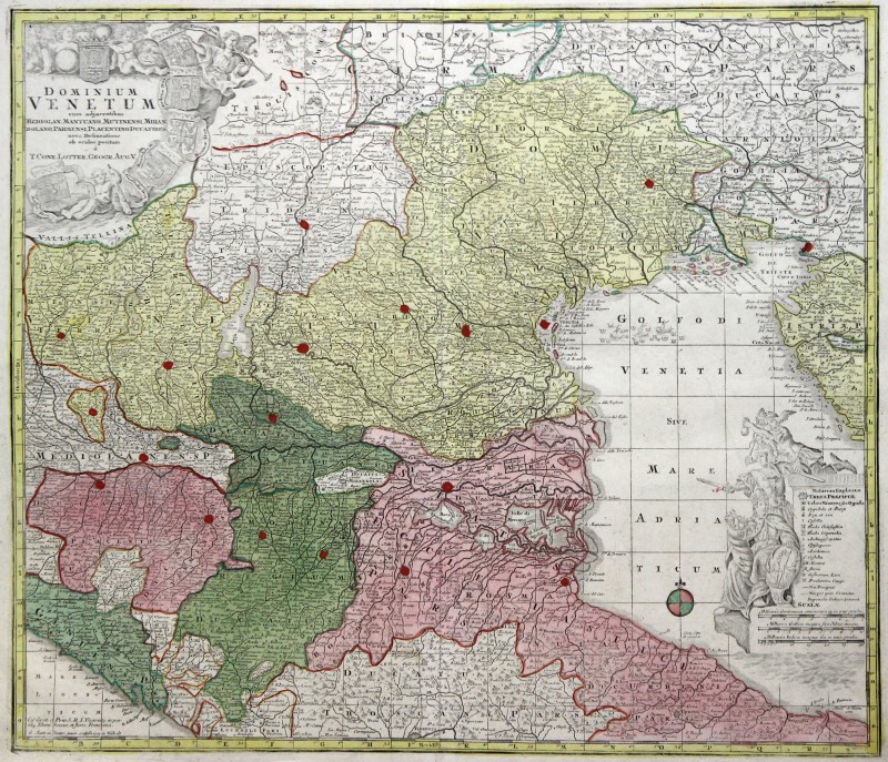 Ritter, Die Welt aus Augsburg, S. 44. Die 1. Ausgabe erschien 1729 bei M. Seutter. - Links oben dek. Kartusche mit 6 Wappen und Engeln, rechts unten Erklärungen. - Gebiet Brixen, Triest, Florenz, Bergamo.