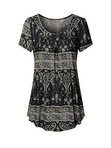 LADIES BOHO FLORAL TUNIC SCOOP NECK LONG TEE TOP BLOUSE - BLACK & TAN - MEDIUM