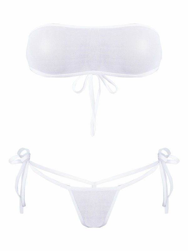Womens See-through Mesh Bikini Set Swimwear Strapless Bra Crop Top with Lace-up Thong.