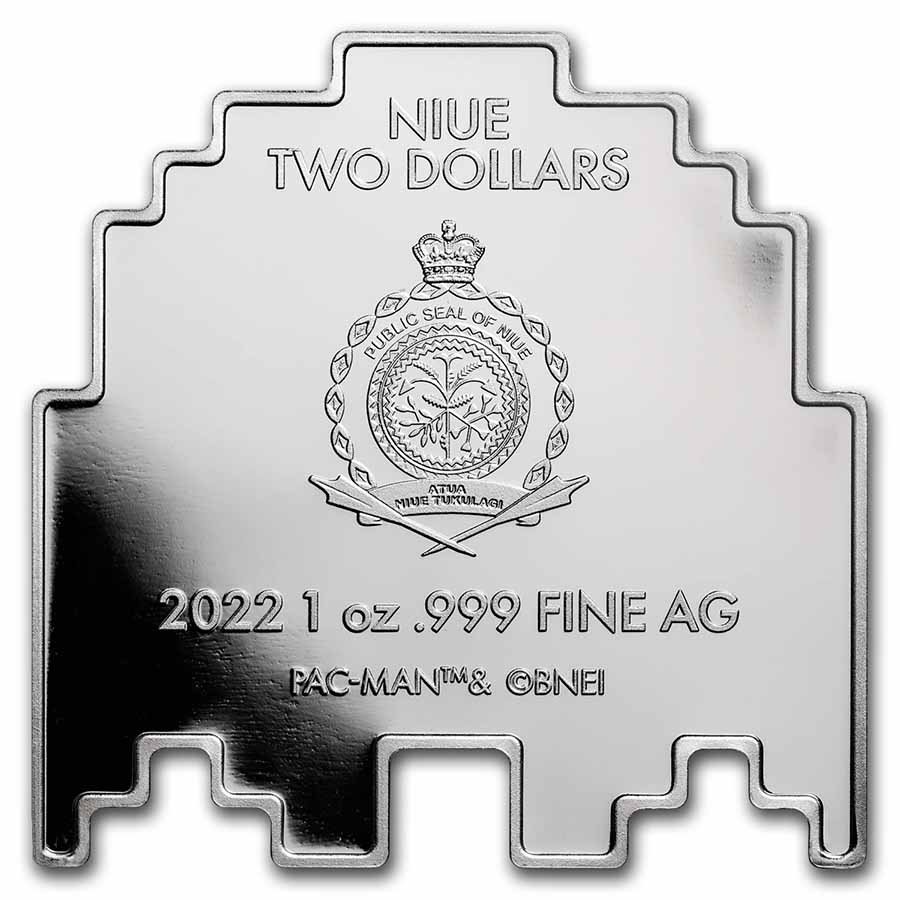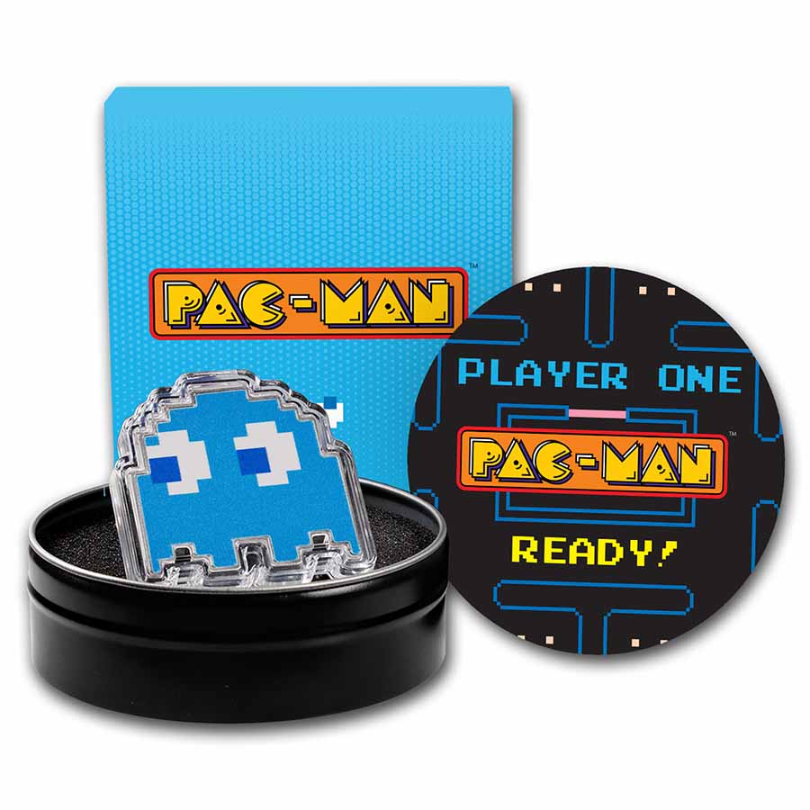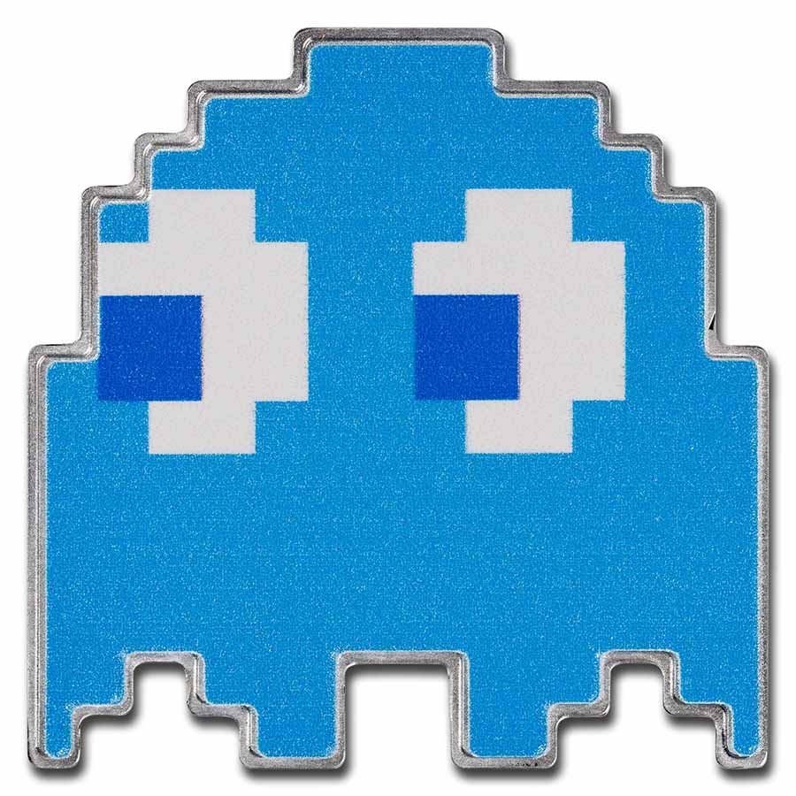 These official PAC-MAN GHOST INKY shaped and blue colored coins make the perfect gift for PAC-MAN fans, coin collectors and investors alike. Add this 2022 PAC-MAN GHOST shaped 1 oz Silver colorized coin to your cart today!