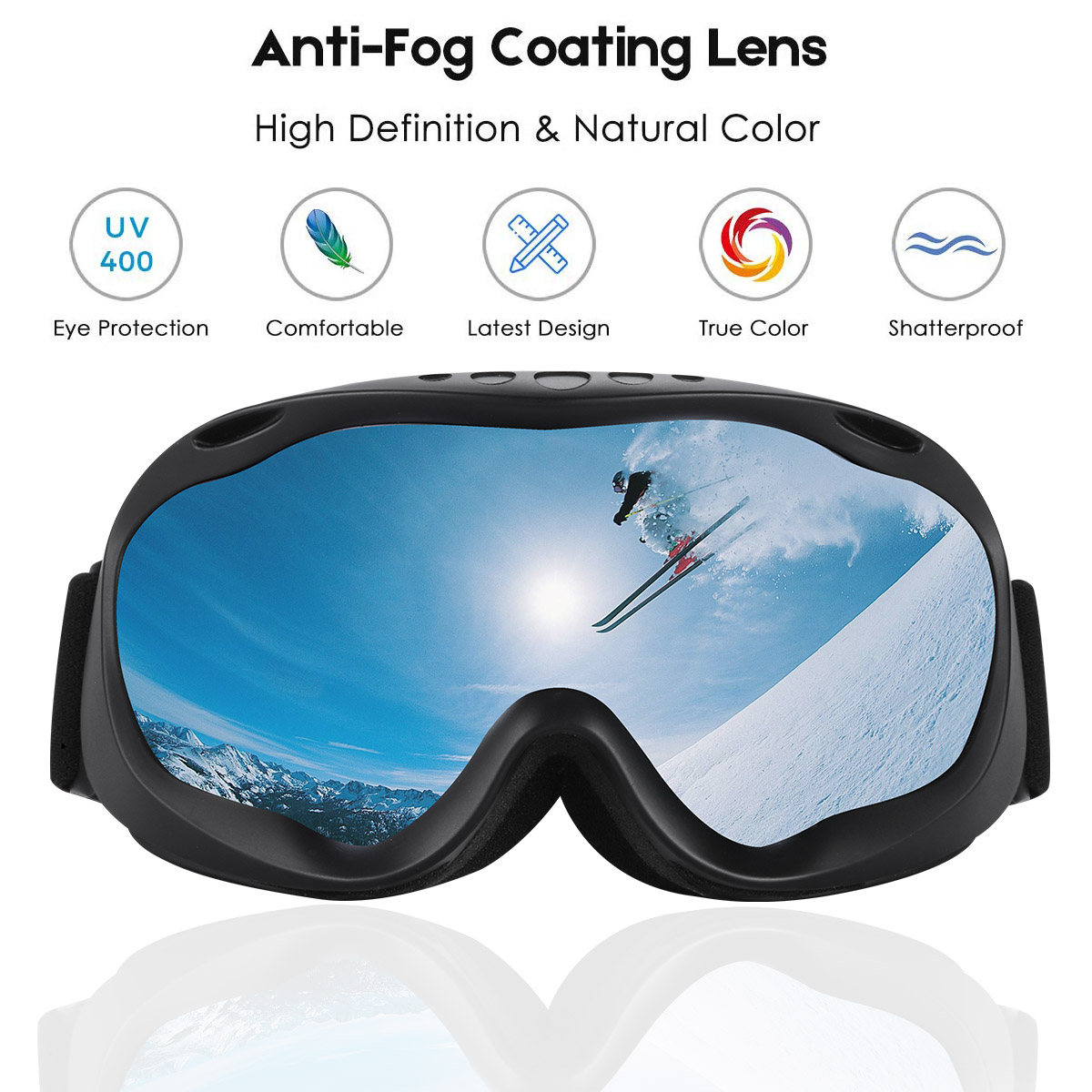 - PERFECT UV 400 PROTECTION - Powerful lens provides 100% UV 400 protection, anti-glare function and wide view angle. The balanced light transmittance makes it suitable for various sports, like skiing, skating, climbing motorcycling, cycling, skydiving, bungee jumping, playing shooting games and snowball fights.