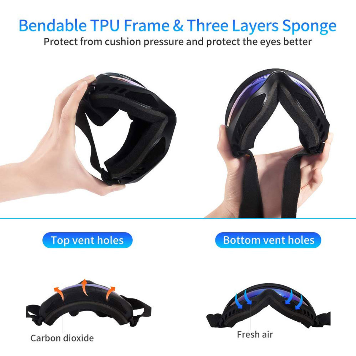- COMFORT & ALL-DIMENSION PROTECTION - The soft and thick foam is padding around your eye sockets for prolonged wear without sweat, discomfort and irritation. Also, with the safe and elastic PU frame, durable and impact resistant PC lens, protecting you from bright sunshine, strong wind and thick snow fall.