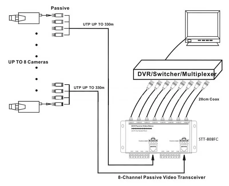 Connection method: Clamp modular plugs for a Cat-5 unshielded twisted pair wire according to the connection order of TIA/EIA-568B (please refer to the following figure), connect the clamped modular plugs to the RJ45 sockets, connect the coax to the BNC. ![]() Application Diagram ![]() Package Included: 1x 8 channel Passive UTPVideo Balun Transmitter Receiver active Adapter Warranty Term: One Year Warranty ![]() ![]() ![]() ![]() |