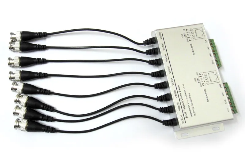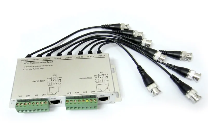 Video balun is to convert the video signal into the balanced signal applicable to be transmitted on common Cat-5 unshielded twisted pair wire with perfect transmission effect, which can be applied in the occasions such as video monitoring and video meeting and can transmit four channels of video image simultaneously on an 8-core Cat-5 twisted pair wire. It can simplify the wiring project and save wire use quantity.