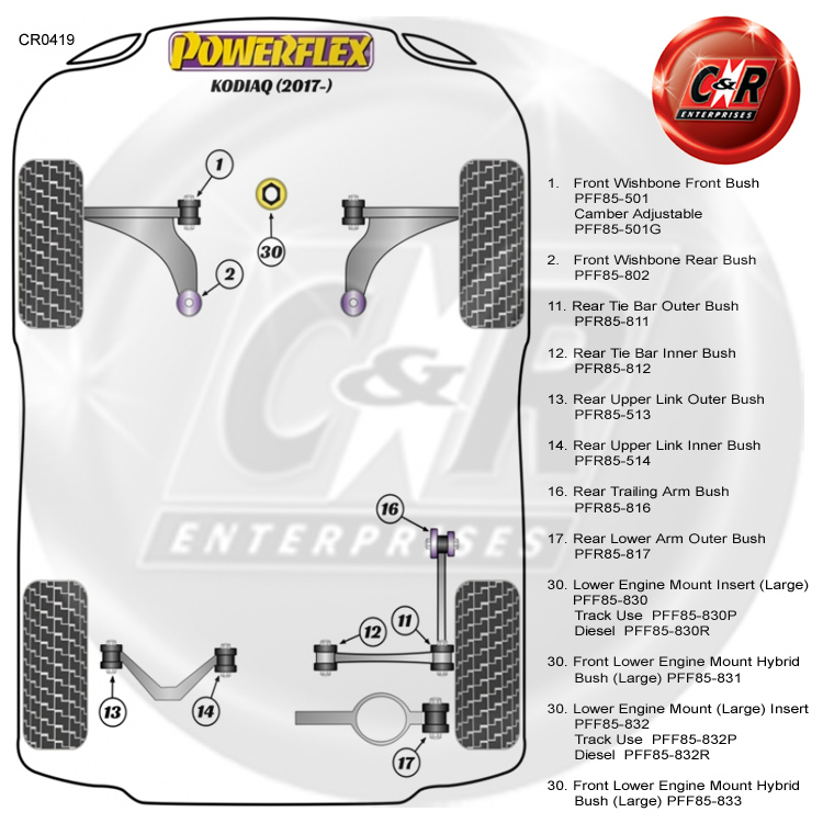 Um die richtige(n) Powerflex-Buchse(n) zu identifizieren, die Sie benötigen, sehen Sie sich bitte das Positionsdiagramm weiter unten in der Auflistung an.