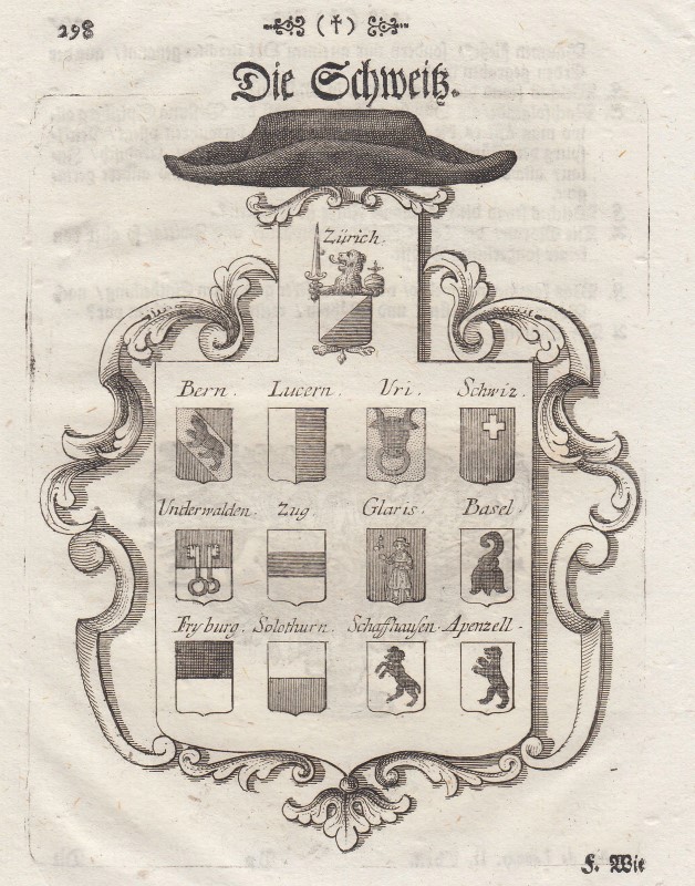 Suiza (Suiza): escudo de armas (escudo de armas): 'La Suiza', Grabado de cobre (anónimo), 1738, 16 x 10 (h) Se muestran 13 escudo de armas cantonal. Número de artículo: 96925