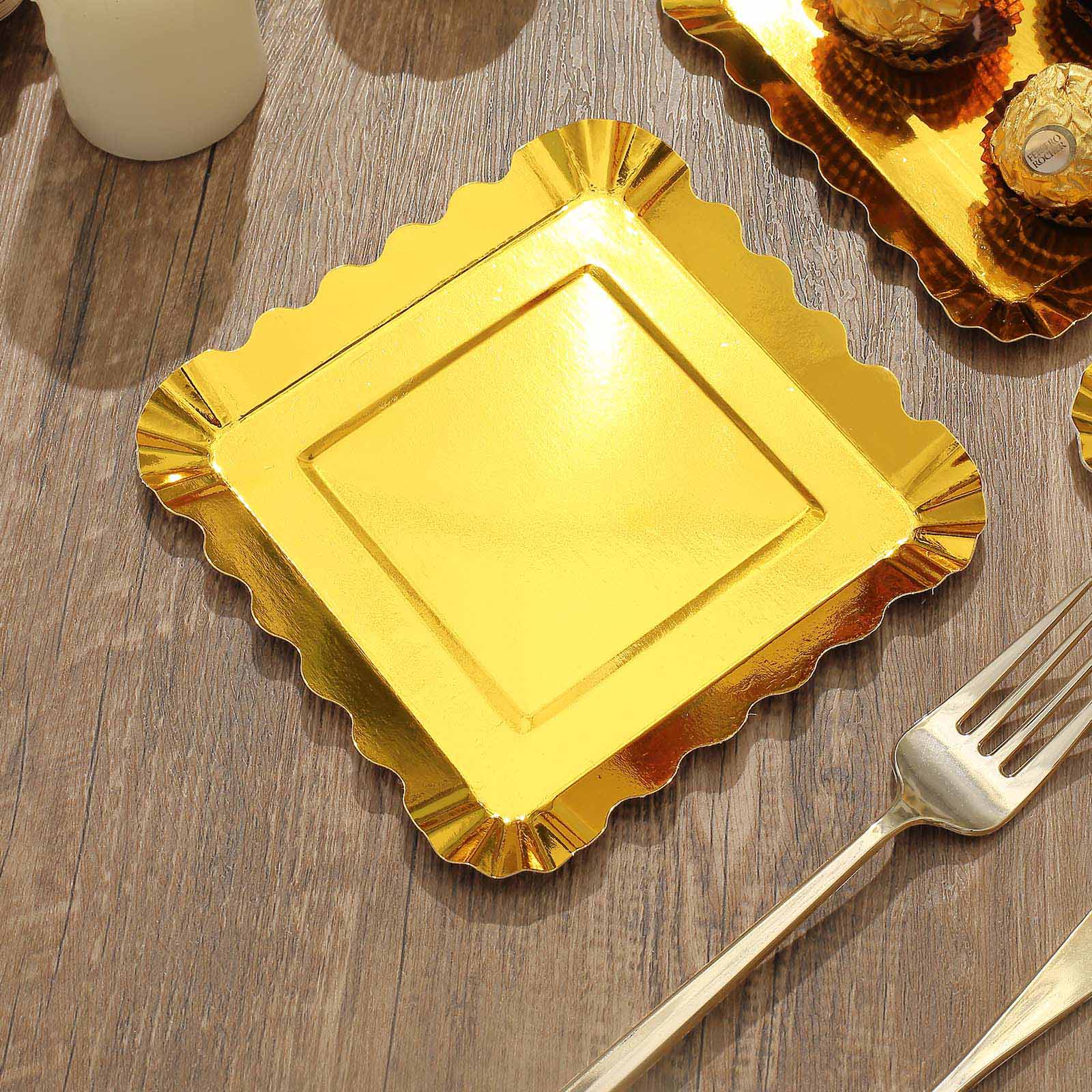 50 Gold 5" Square Disposable Dessert PAPER PLATES Scalloped Trim
