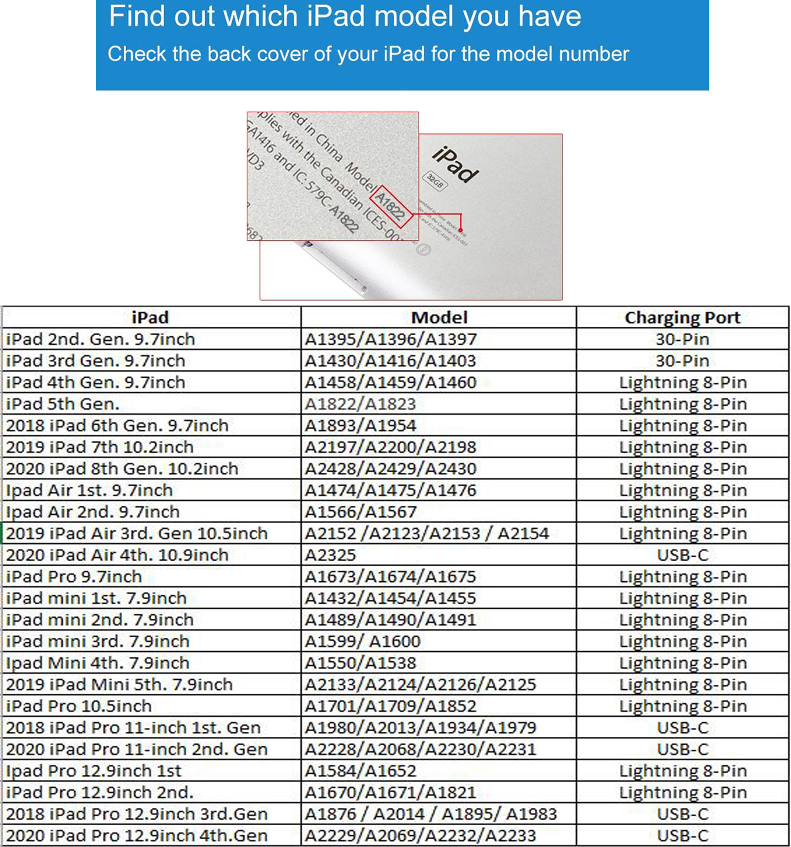 - PERFECT MATCH - Specifically designed for Apple iPad: 2019 iPad 7th 10.2inch - A2197/A2200/A2198, iPad 5th model:A1822/A1823, 6th generation model:A1893/A1954,iPad Pro 9.7inch-A1673/A1674/A1675, iPad Mini 4th/5th.- A2133/A2124/A2126/A2125/A1550/A1538,iPad Mini 1 2 3, iPad Air 3rd./iPad Pro 10.5inch - A2152 /A2123/A2153 / A2154/A1701/A1709,iPad Air - A1474/A1475/A1476, iPad Air 2-A1566/A1567, 2018 iPad 11-inch -A1980/A2013/A1934/A1979, 2018 iPad Pro 12.9inch 3rd.Gen - A1876 / A2014 / A1895/ A1983, Ipad Pro 12.9inch 1st - A1584/A1652, iPad Pro 12.9inch 2nd.-A1670/A1671/A1821, iPad 2th 3th 4th Gen. - A1395/A1396/A1397 A1430/A1416/A1403 A1458/A1459/A1460