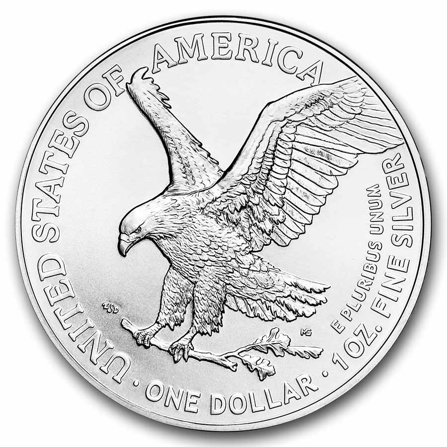 - Reverse: The design depicts a single eagle coming in for a landing, carrying an oak branch as if to add it to a nest. Inscriptions are UNITED STATES OF AMERICA, E PLURIBUS UNUM, 1 OZ. FINE SILVER and ONE DOLLAR.