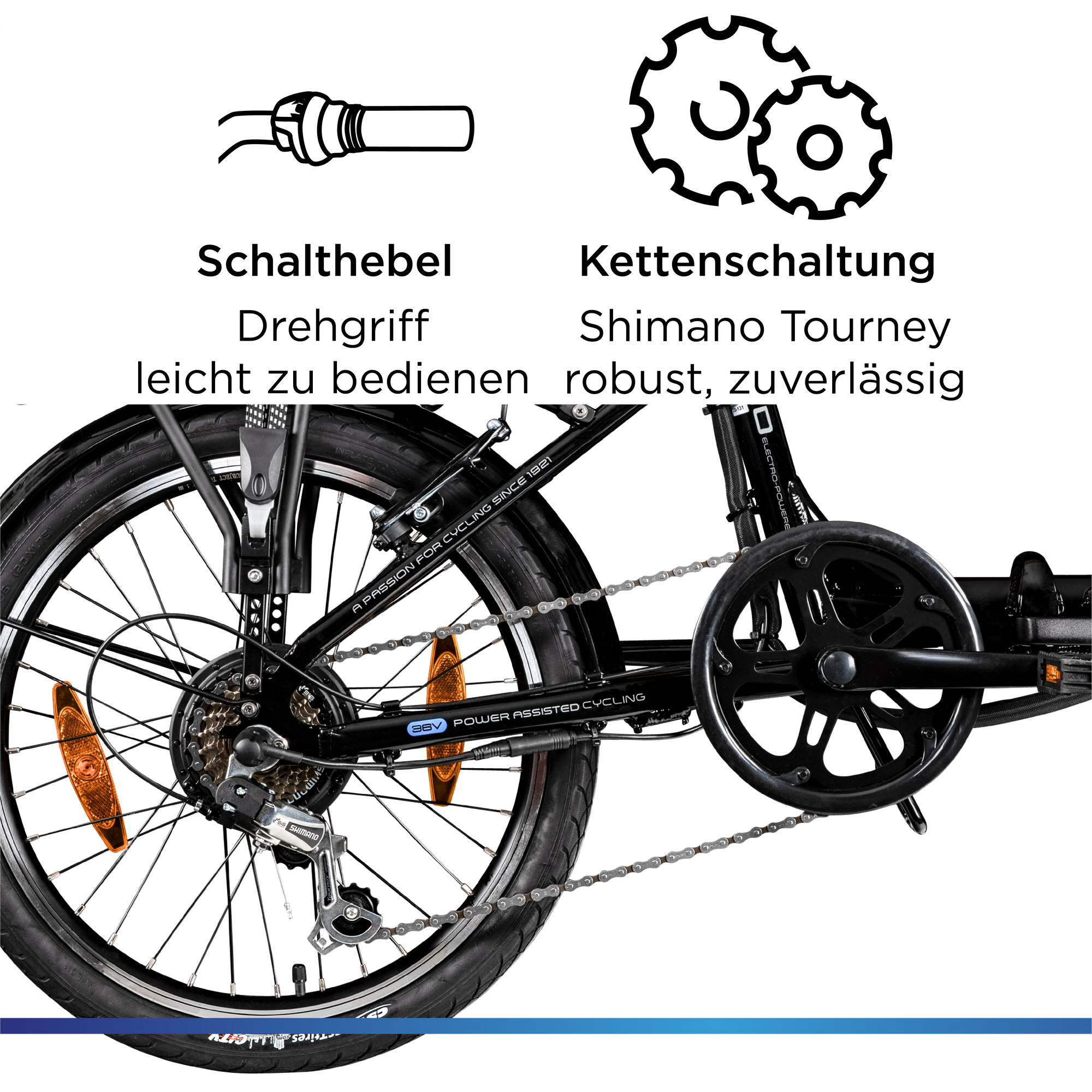 Daneben besitzt das Zündapp Z110 eine 7 Gang Schaltung von Shimano. Schaltwerk und Drehgriffschalter aus der Baugruppe Tourney zeichnen sich durch robuste Bauweise aus und liefern, einmal korrekt eingestellt, lange zuverlässig flüssige Schaltvorgänge. Gebremst wird das Faltrad mit V-Brakes an beiden Rädern. Diese Felgenbremsen ermöglichen präzise Bremsvorgänge und benötigen neben einem gelegentlichen Wechsel der Bremsbeläge keine besondere Wartung.