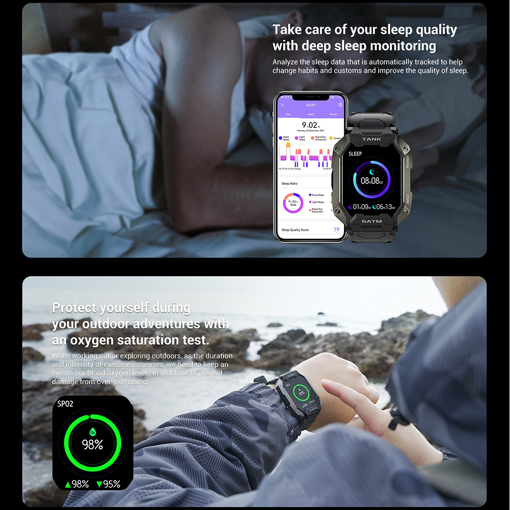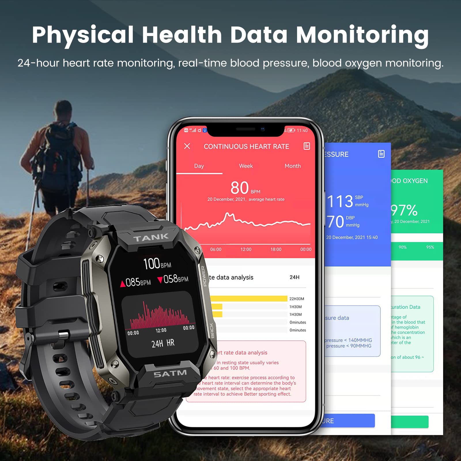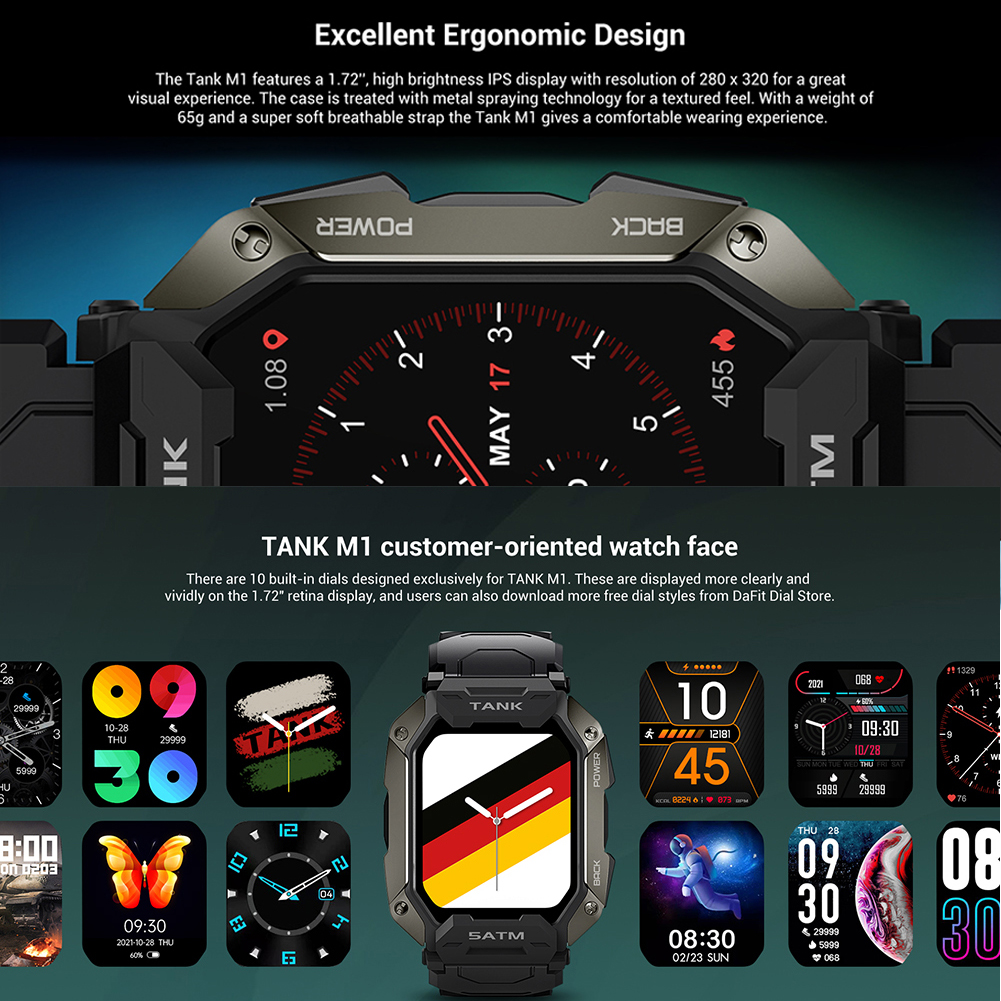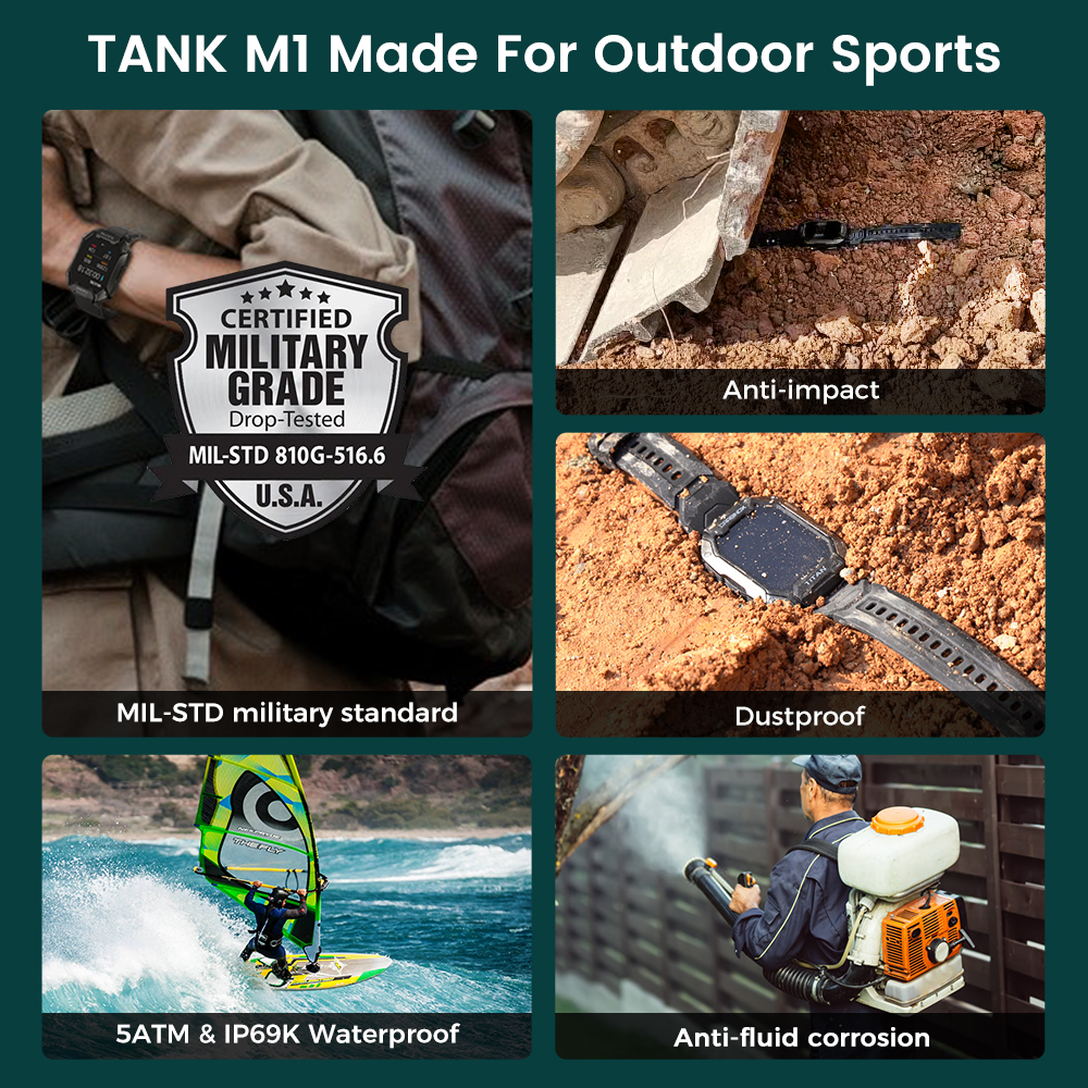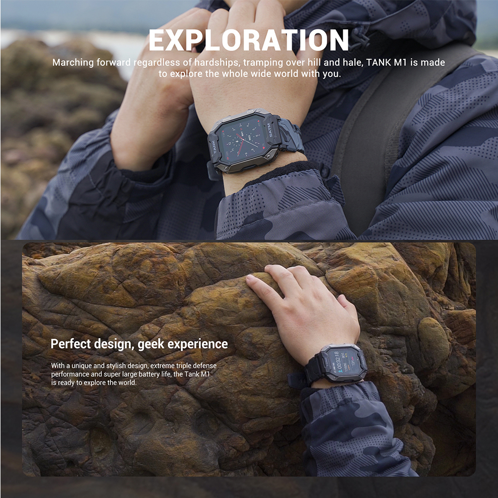 With sharp edges and corners, The sports watch features a tough sports style, highly resistant to impact, crush, dust, shock, corrosion and extreme temperature, making it a professional rugged smartwatch for outdoor activities.