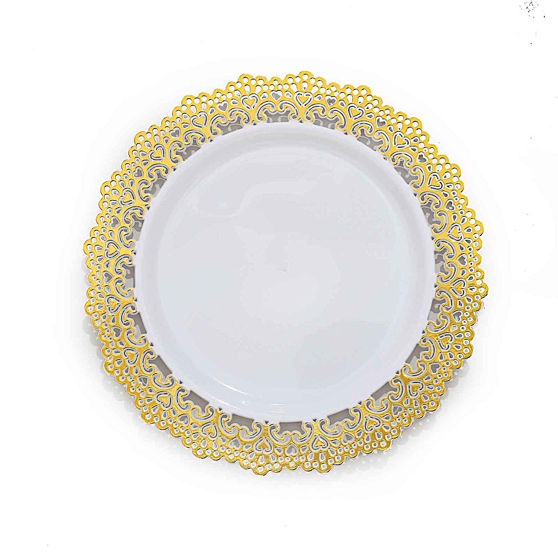 10 Round 7" White Disposable Salad Dinner Plastic PLATES Gold Lace Trim