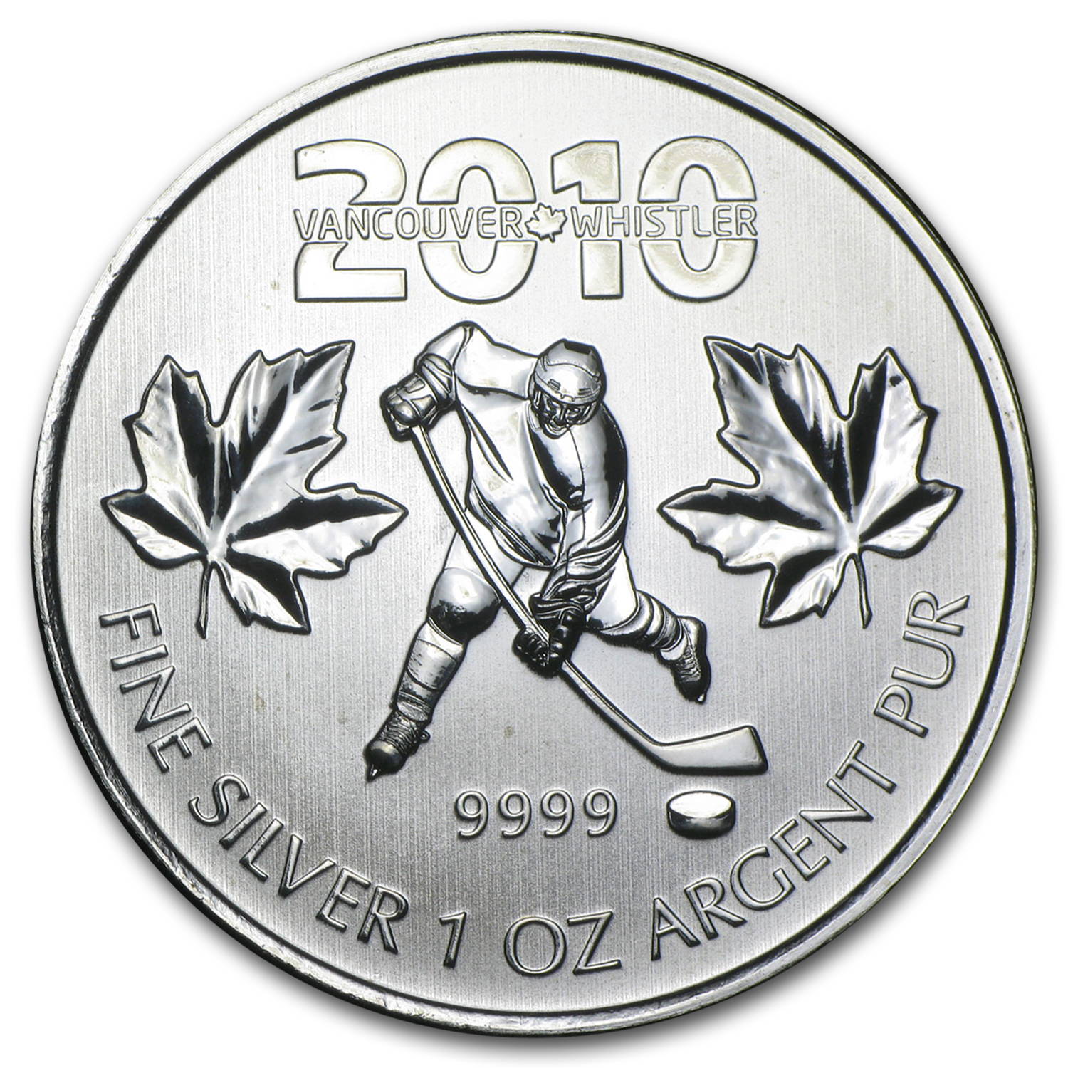 This popular commemorative coin is the last in the series commemorating the 2010 Winter Olympics in Vancouver! It features a special design of a hockey player between two maple leafs beneath the 2010 Winter Olympics logo. The obverse is shared by the image of Queen Elizabeth II and the Olympic Games logo. These .9999-fine pure Silver 1 oz coins come in a Brilliant Uncirculated finish.