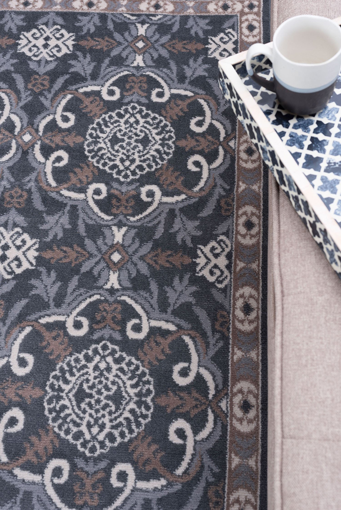Botanical motifs intertwine to create this transitional brocade area rug design. A fitting complement to multiple decorating styles. In fashionable colors including gray, beige, cream, and navy blue to freshen any space. Quality power loom construction of soft polypropylene yarn with jute backing offers a great value. Vacuum on high pile setting; spot clean with mild detergent and water when necessary. Do not bleach.