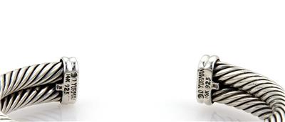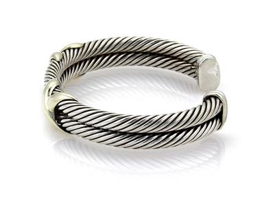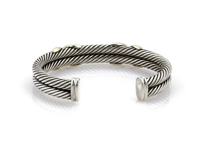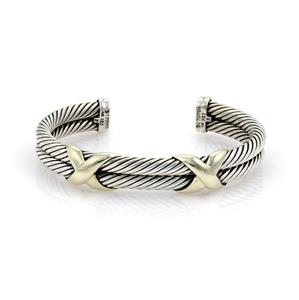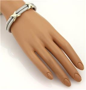 This is an authentic bracelet by David Yurman, it is crafted in 925 sterling silver with 14k yellow gold accent in a polished finish, the double style band is in Yurman's famous cable wire design, with 2 polished yellow gold X displayed on the front part of the band. It has full designer signature with the metal content.