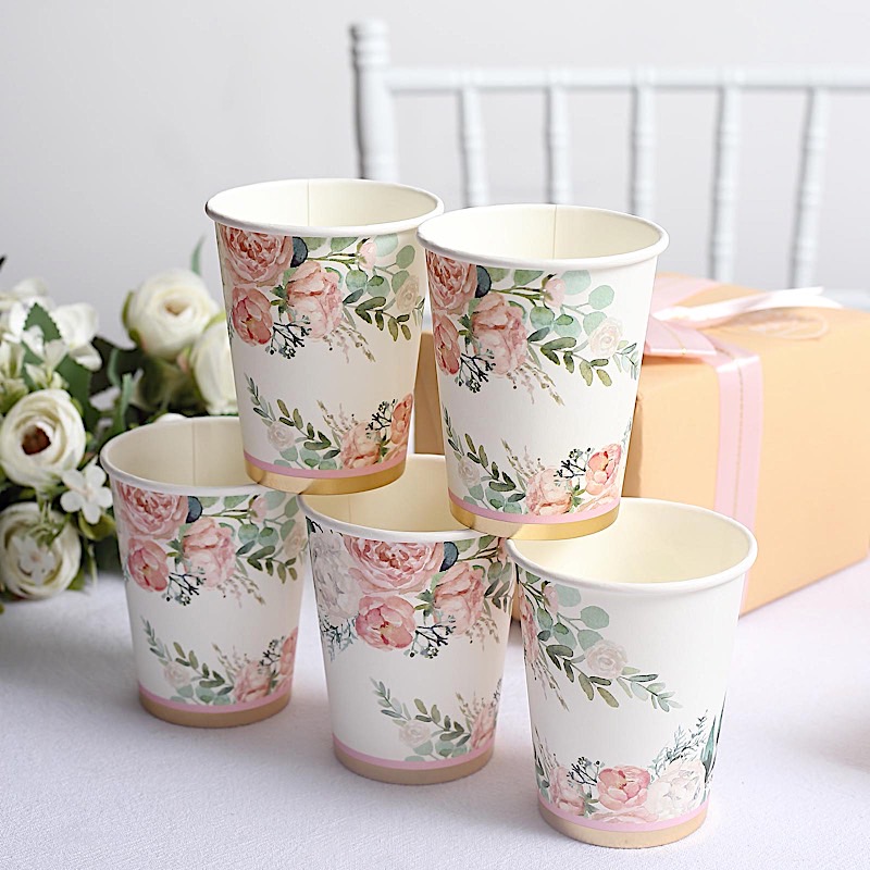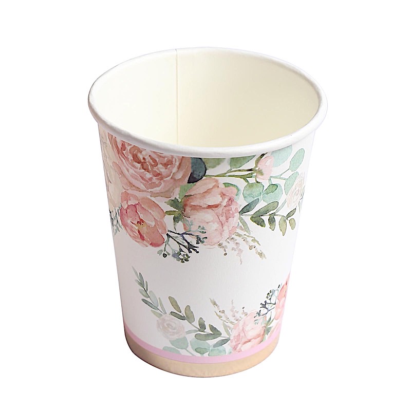 These disposable paper cups will serve your punch, juice, coffee or any hot or cold party drinks in style! Featuring a peony flower design these drinking cups make a picture-perfect accent for your tables and easy cleanup. Perfect for catered events, baby showers, birthdays, family dinners or even for everyday use. Keep your guests hydrated!