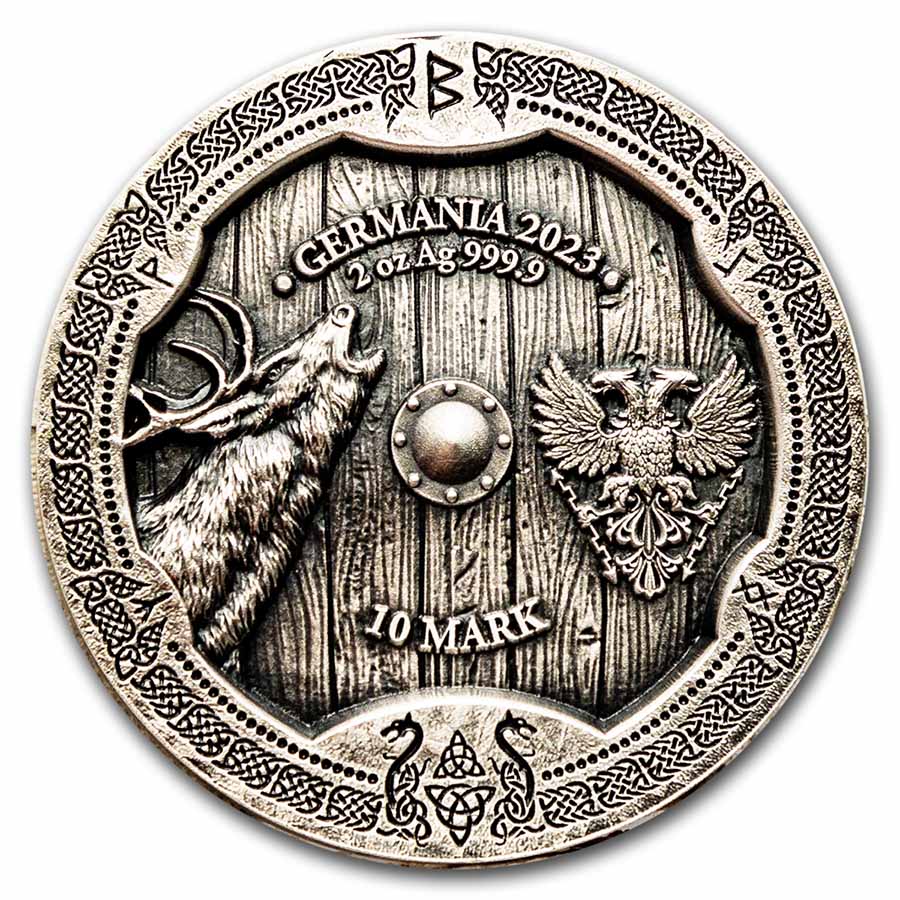 - Reverse: Features a unique design depicting both the Germania Mint double-headed eagle as well as Germanic runes and a howling buck deer. Weight and purity are displayed along the top.