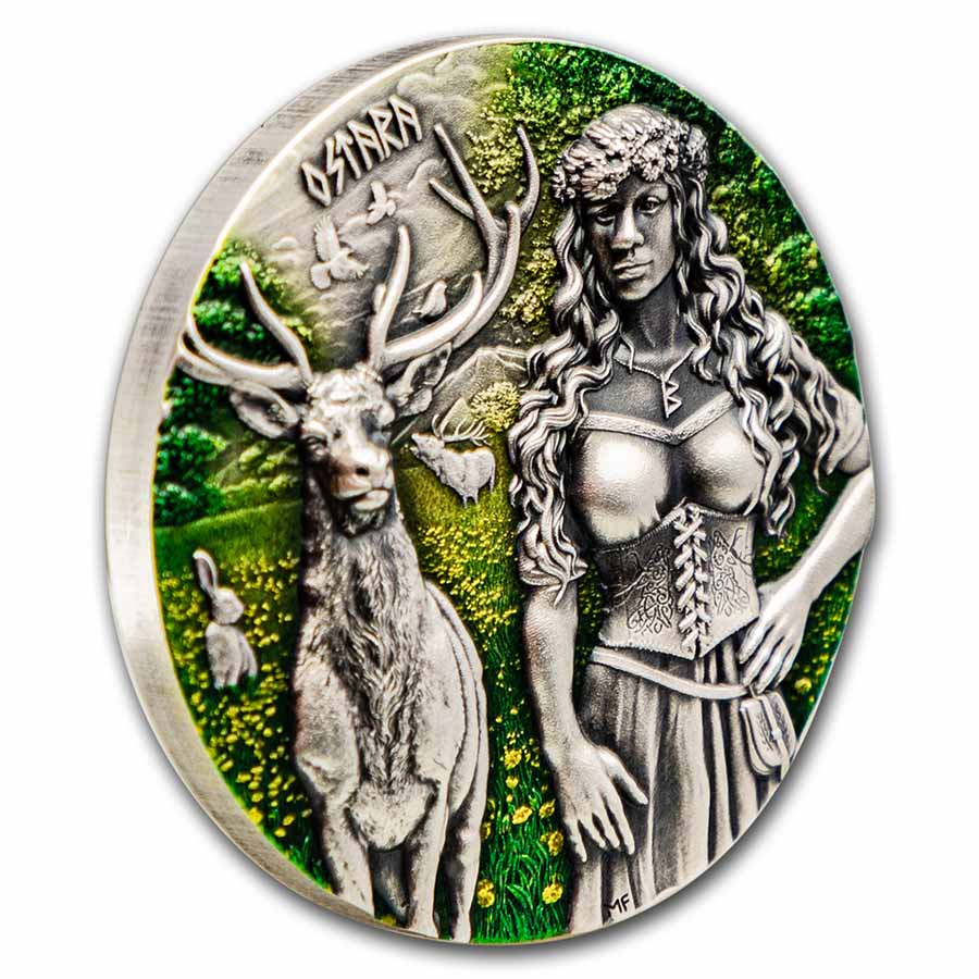 - Obverse: Depicts Ostara, supporter of the bravest warriors who fall in battle, standing in a meadow next to a buck and a hare. Her hair is wreathed in flowers and another buck is seen in the background in the meadow.