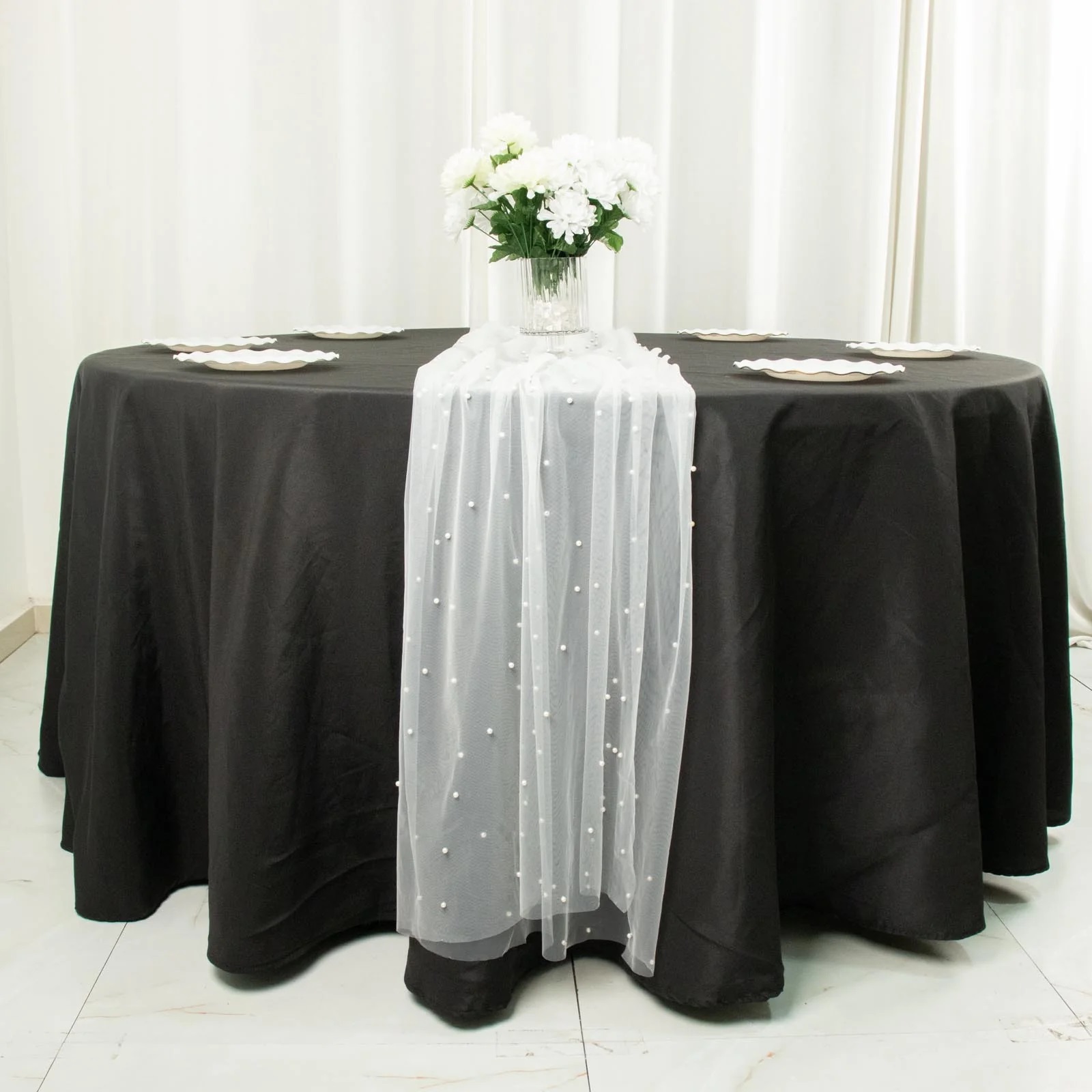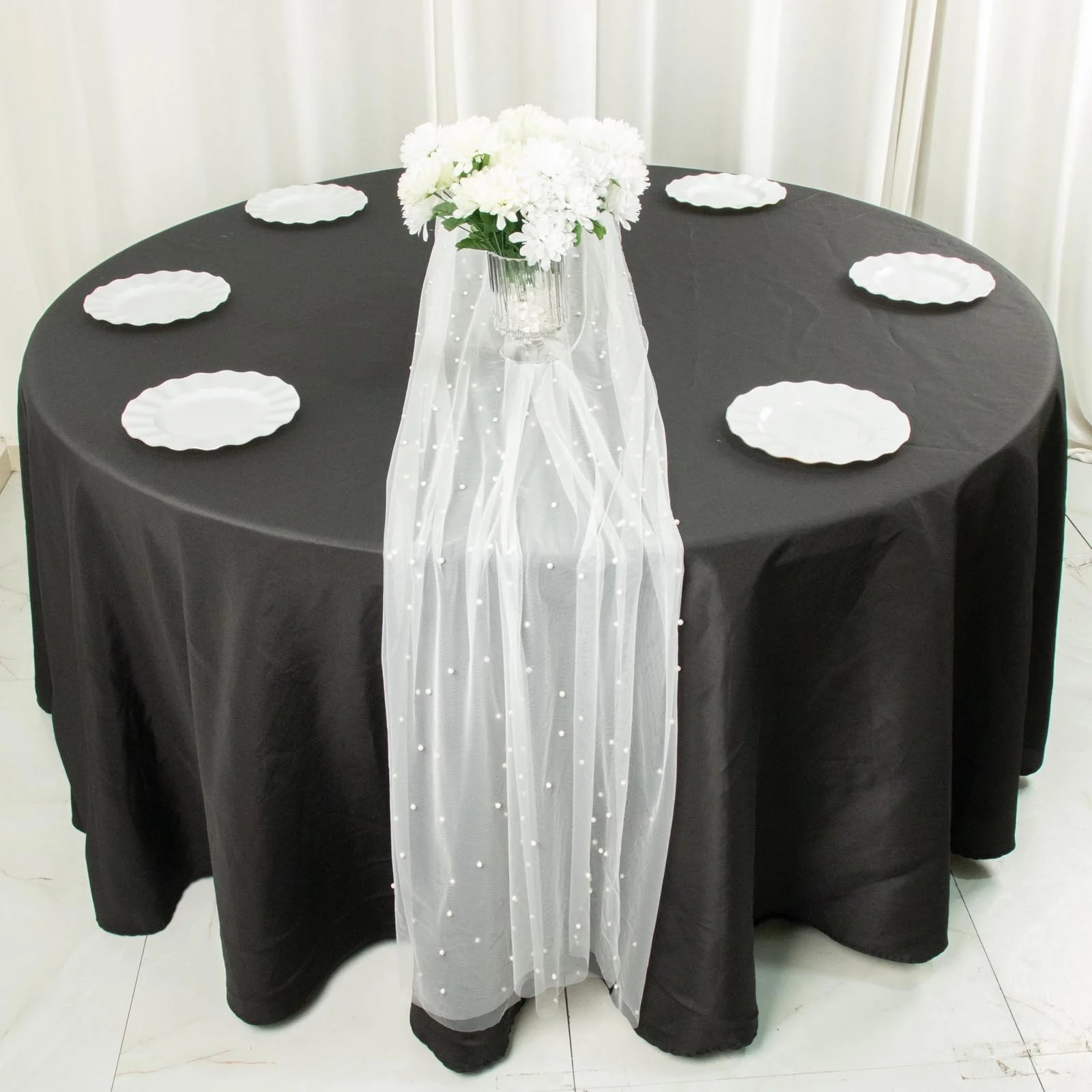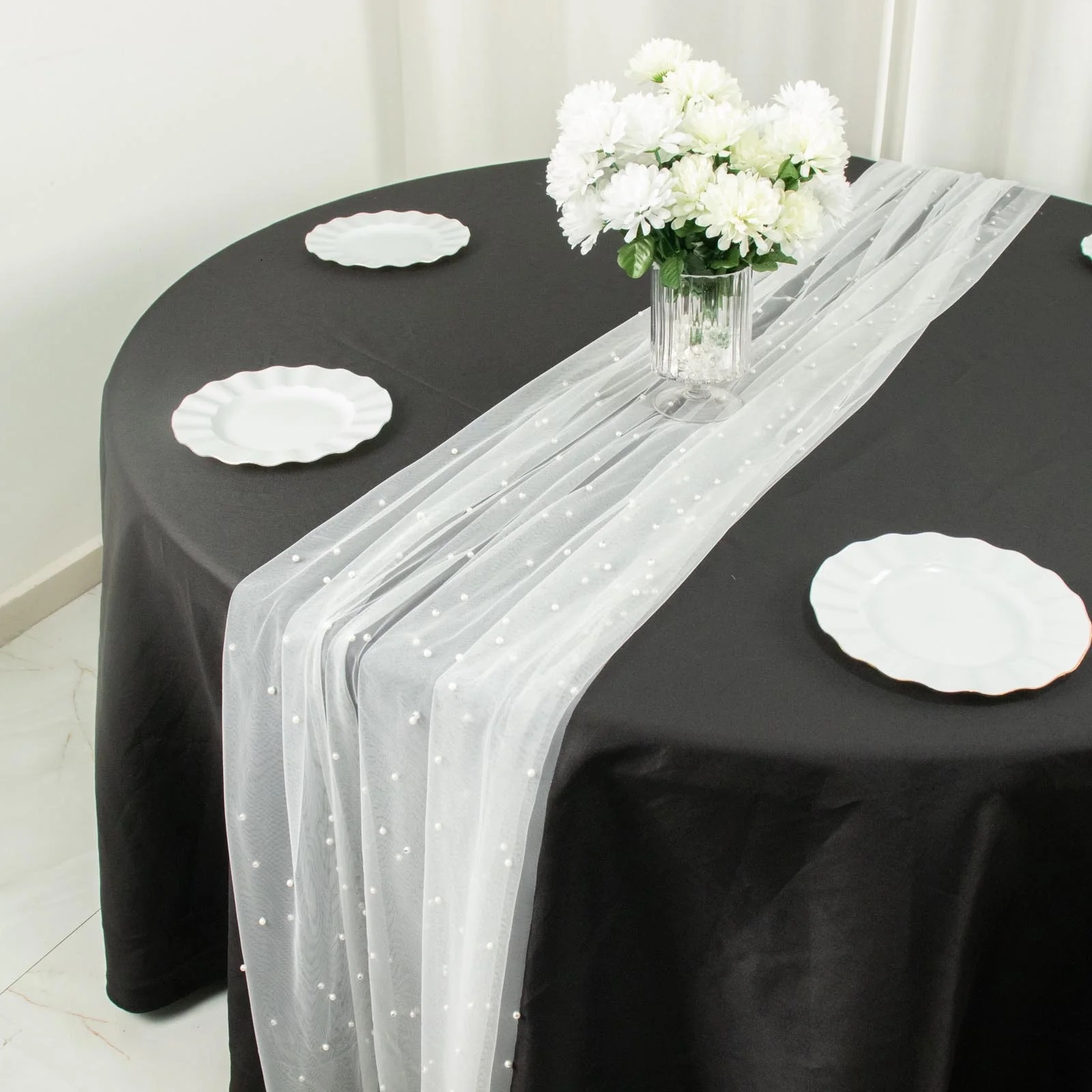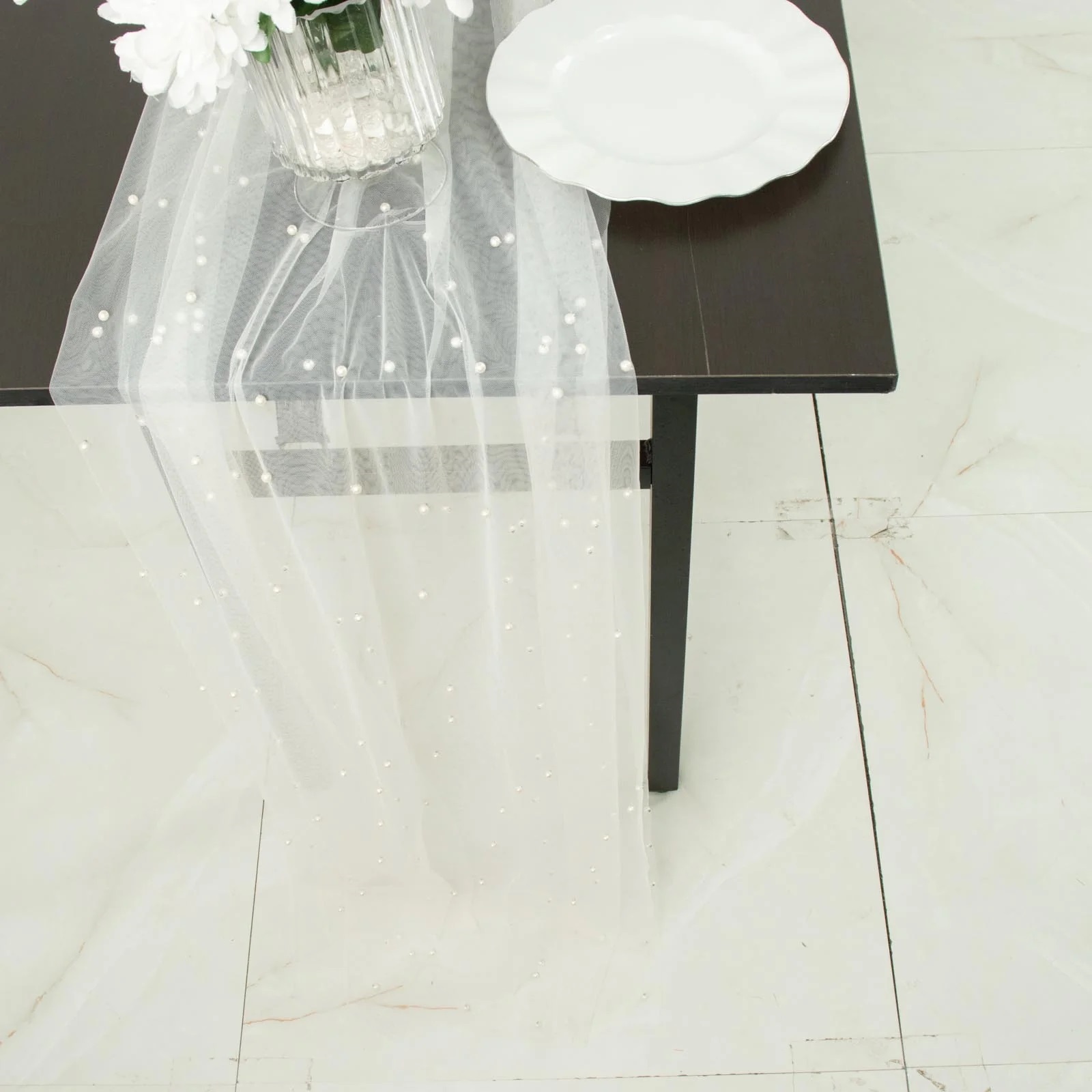Bring elegance to your party and accessorize your tables with high-quality tulle fabric table runners. This sheer table runner with faux pearl accents will create a sophisticated look and the perfect ambiance for any special occasion. Great for weddings, parties, events, bridal showers, anniversaries, birthdays and more. Pair this table runner with other matching linens and tabletop decorations for an unforgettable dining experience. You can also cut it into the desired size and used it as an accent for your wedding pillar and arches for a unique and amazing party decoration. The possibilities are endless!