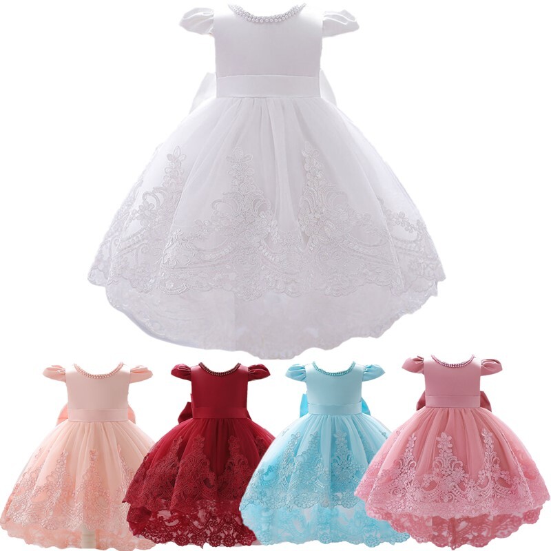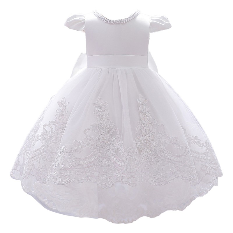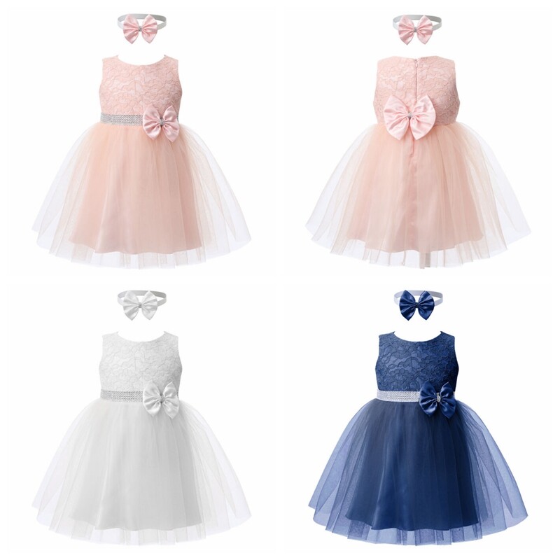 Baby girls bowknot dress, cap sleeve, V back, the neckline is decorated with beads, invisible zipper for easy wearing.