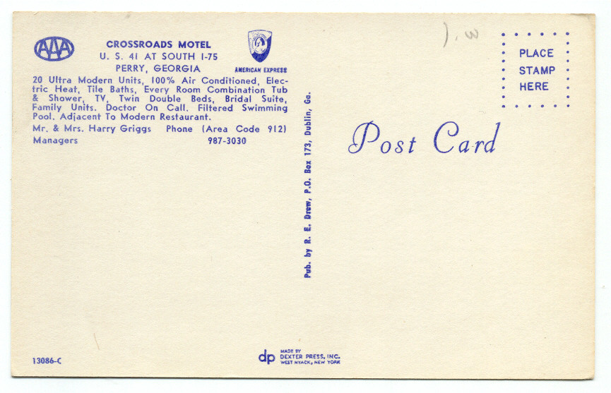 Perry GA Crossroads Motel Postcard ~ Georgia