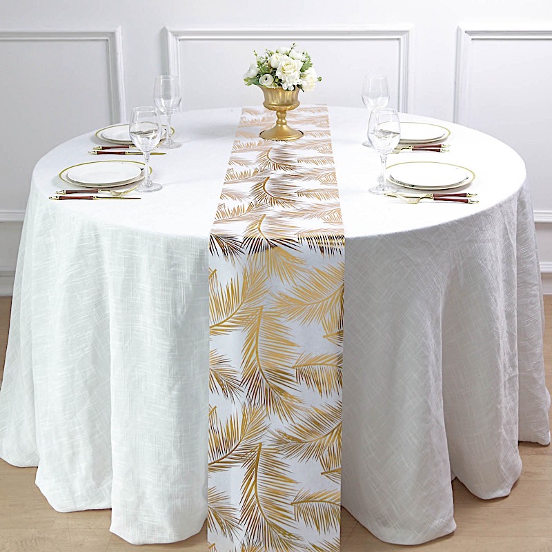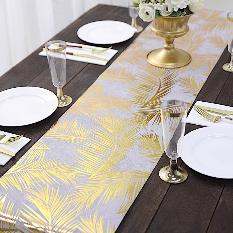Add visual interest to your event and accessorize your tables with this high quality non-woven fabric table runner with metallic tropical leaves prints. Perfect for adding a touch of glitz and glam to your dining tables. This table runner is an easy way to elevate the look of your tabletop for formal or casual meals, dinner parties, weddings, bridal showers, birthdays or any special events.