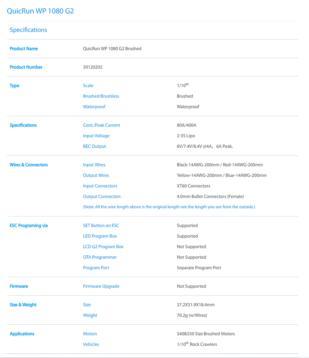 The reliable hardware combined with powerful software ( features an array of programmable parameters like start force , drag brake rate , and etc.).Creates an ideal power solution to 1 / 10th , 1 / 8th rock crawlers.