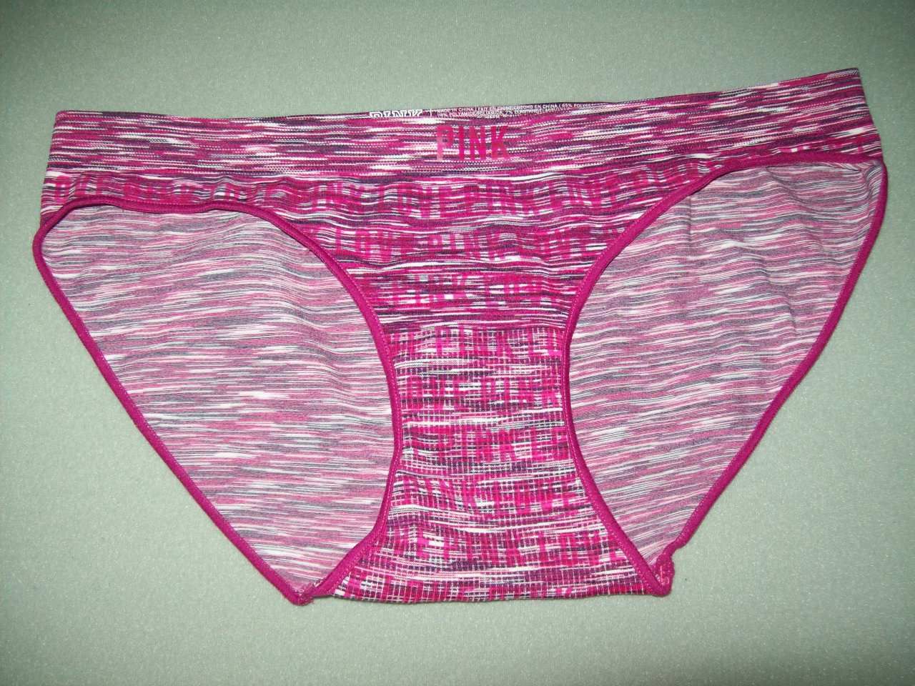 65% POLYESTER/ 28% POLYAMIDE/ 7% ELASTANE BODY IN BURGANDY SPACE DYE. KNIT IN WAISTBAND. ELASTIC AT LEG OPENINGS. LOVE PINK PRINT FRONT PANEL.