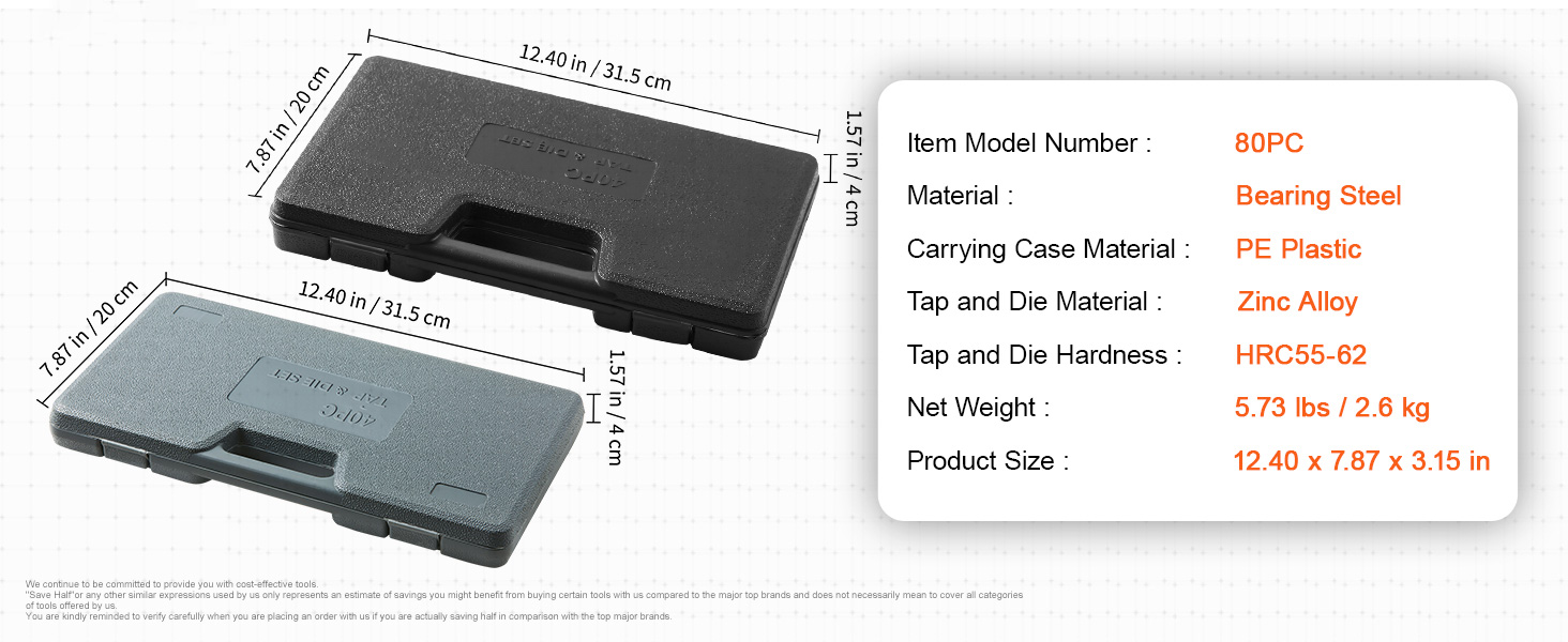 A professional 80-piece set of taps and dies, including various sizes of 34 pcs dies, 34 pcs taps, 2 x die handle, 2 x tap wrench, 2 x T-type tap wrench, 2 x screw pitch gauge, and 2 x screwdriver, assisting you in efficiently completing thread-cutting tasks.