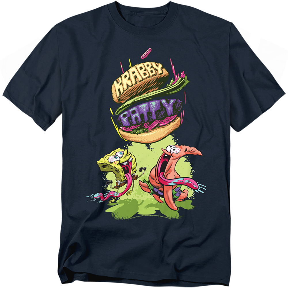 - Officially licensed and printed in the USA by Trevco. From the fan favorite SpongeBob SquarePants, comes this navy adult t-shirt. Sized for men in regular US sizing. Made out of cotton.