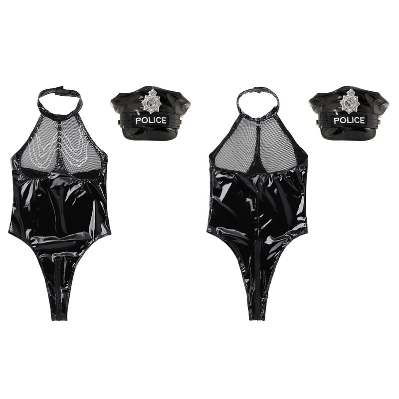 Women police uniform outfit, 7-piece set, includes short sleeve jumpsuit, waist belt, thigh belts, badge brooch, hat and plastic manacles.