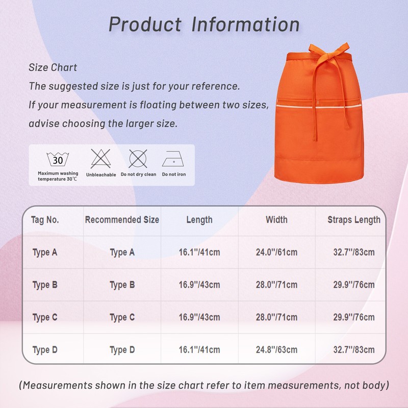 The waiter apron is made of high quality fabric, soft, breathable, comfy to touch, sturdy and durable, easy to clean.