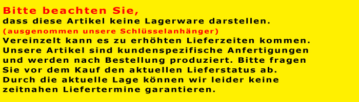 Bitte beachten Sie, dass diese Artikel keine Lagerware darstellen. Vereinzelt kann es zu erhöhten Lieferzeiten kommen. Unsere Artikel sind kundenspezifische Anfertigungen und von der Rückgabe ausgeschlossen.