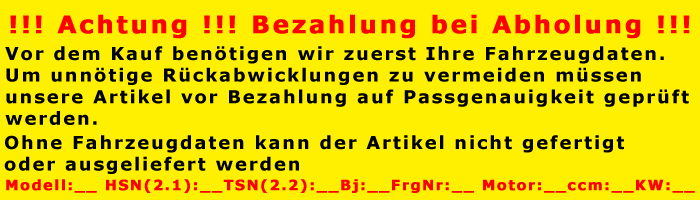 Fragen: Eine Bearbeitung ist nur mit Bereitstellung aller Fahrzeugdaten möglich. Ohne Bereitstellung der für uns notwendigen Fahrzeugdaten, können wir die Ware nicht produzieren bzw. ausliefern. Modell:__ HSN(2.1):__TSN(2.2):__Bj:__FrgNr:__ Motor:__M-Typ:__ccm:__KW:__dB__ |