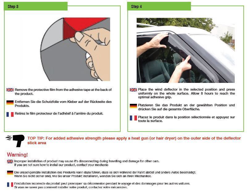 Mounting is done by using heavy duty adhesive 3M tape (supplied). The push in / clip in type can give trouble as manufacturer's have the designed the window frame for the window only. This is why adhesive fit deflectors are preferred. Once fitted correctly, as per our instructions, these deflectors are guaranteed to last the lifetime of the vehicle.