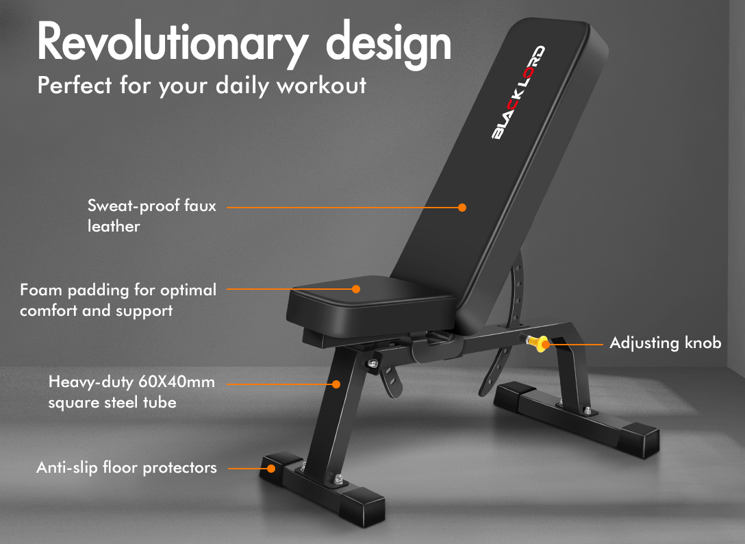 * Heavy-duty 60X40mm steel tube frame with gloss finish* Perfect for incline/ flat/ dumbbell press, seated dumbbell press, chest flys, dumbbell concentration curls, one-arm dumbbell row* Sweat-proof & anti-slip faux leather* High density foam with anti-slip PVC covers* 12-level backrest adjustments with safety quick-release knob* Adjustable backrest for flat and incline positions* 3-angle seat pad adjustments with safety quick-release knob* Reinforced rubber feet for ultra-stability