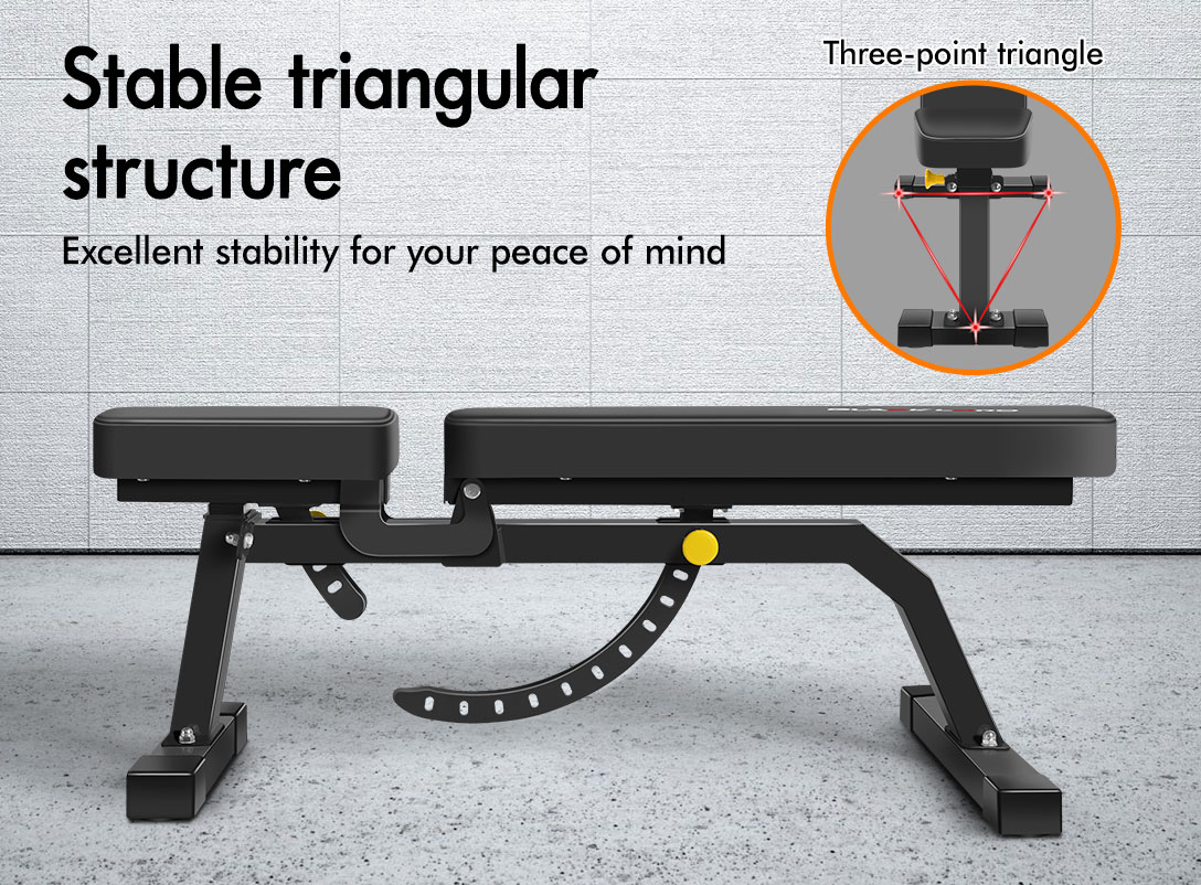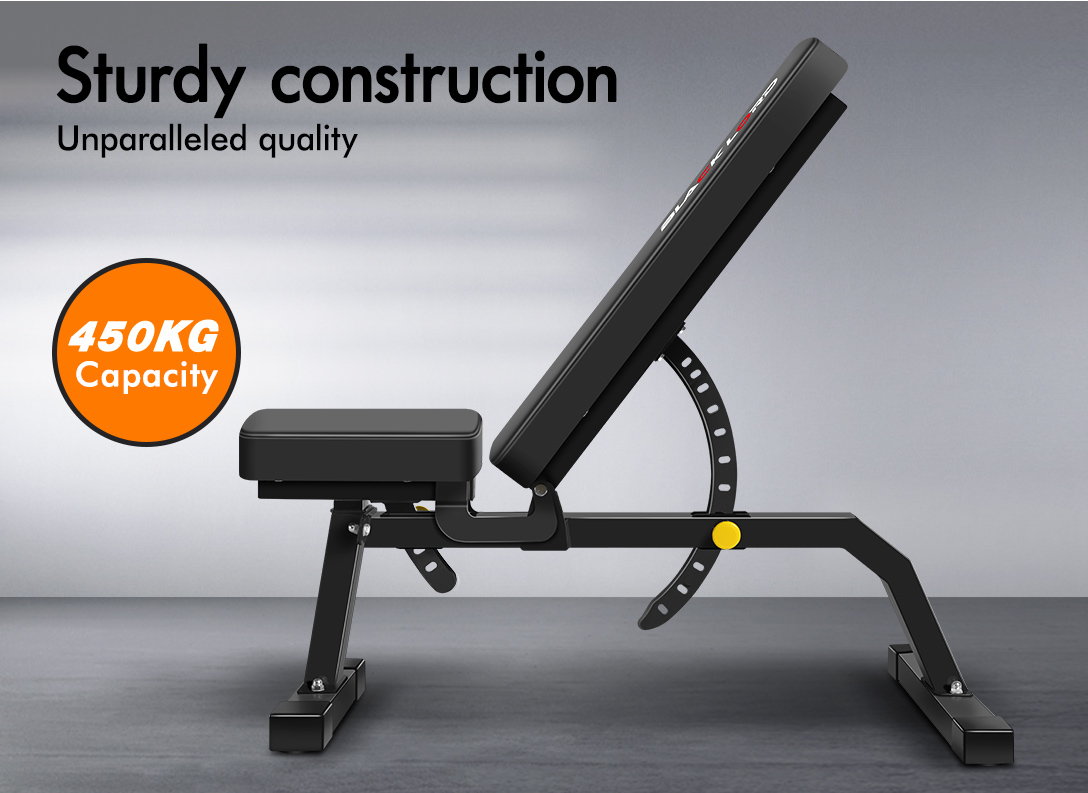 Constructed from heavy-duty steel, extra-thick foam, and breathable but sweat-proof faux leather, the bench is designed to be durable with 450kg weight capacity and offers rock-solid stability. The gorgeous powder-coated paint job will keep it looking fresh for years to come. Best of all, the ultra-comfortable backrest can conveniently be adjusted to flat and incline positions from 90 to 180 degrees through 12-level adjustment knob, while the ultra-thick seat pad can be adjusted at 3 angles for a variety of exercises. Crafted with safety in mind, the bench is also equipped with sturdy rubber feet to keep the metal frame from damaging flooring and to keep the bench in place.