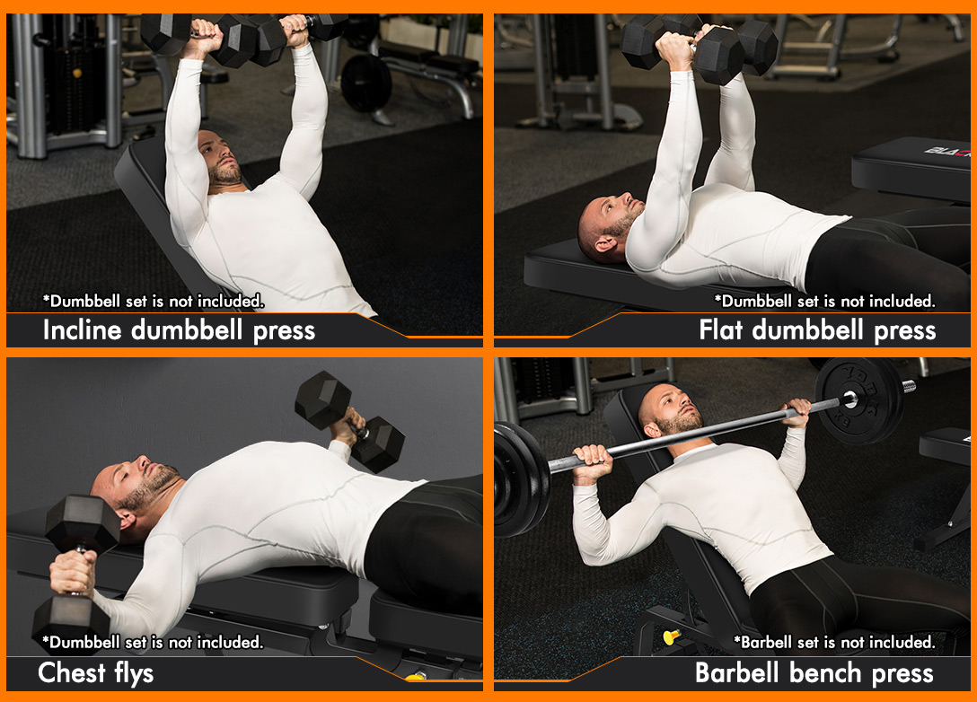 This weight bench contributes to a wide array of strength-training exercises, including incline/ flat/ dumbbell press, seated dumbbell press, chest flys, dumbbell concentration curls, one-arm dumbbell row and more. It is a great device at home and can reach your workout aims for sure.