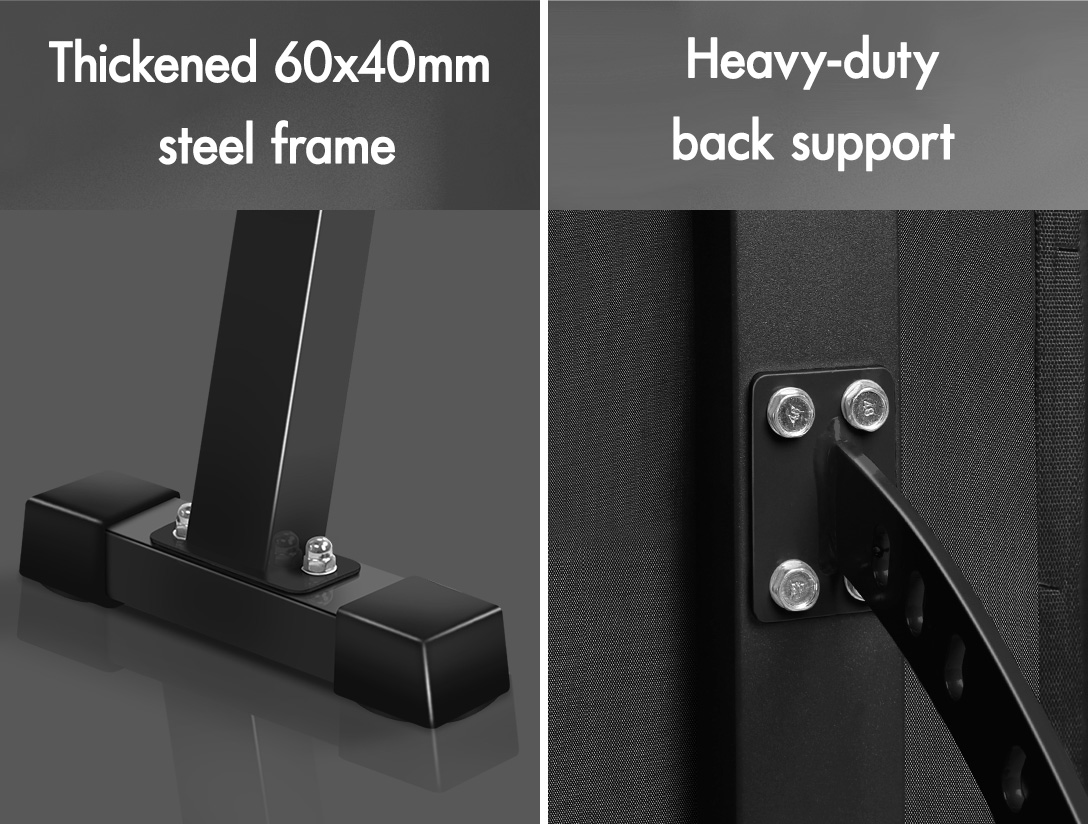 Specifications* Colour: Black* Material: Steel* Weight capacity: 450kg * Main tube: 60X40mm steel tube* Thickness of seat and backrest: 6cm* Overall Dimensions: 129cm x 51.5cm x 46cm, refer to dimension photo for detailed sizes * Assembly required: Yes