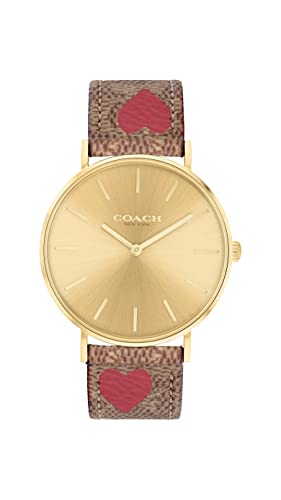 Coach 14503886 Gold Dial Brown Leather Strap Ladies 36mm Perry Watch. Brand New Authentic Coach Perry Gold Women's Watch Model 14503886. Stainless Steel case with Brown Leather strap. Yellow Gold dial. Battery Operated Quartz movement. Pull/Push crown. Mineral crystal. Round case shape. Case size: 36mm. 30 Meters - 100 Feet water resistant
