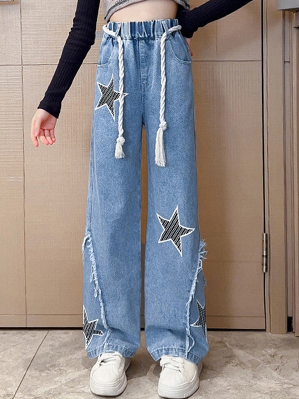 Wide-leg jeans for girls, star printed, ripped details at the bottom of the pants, unique and stylish.