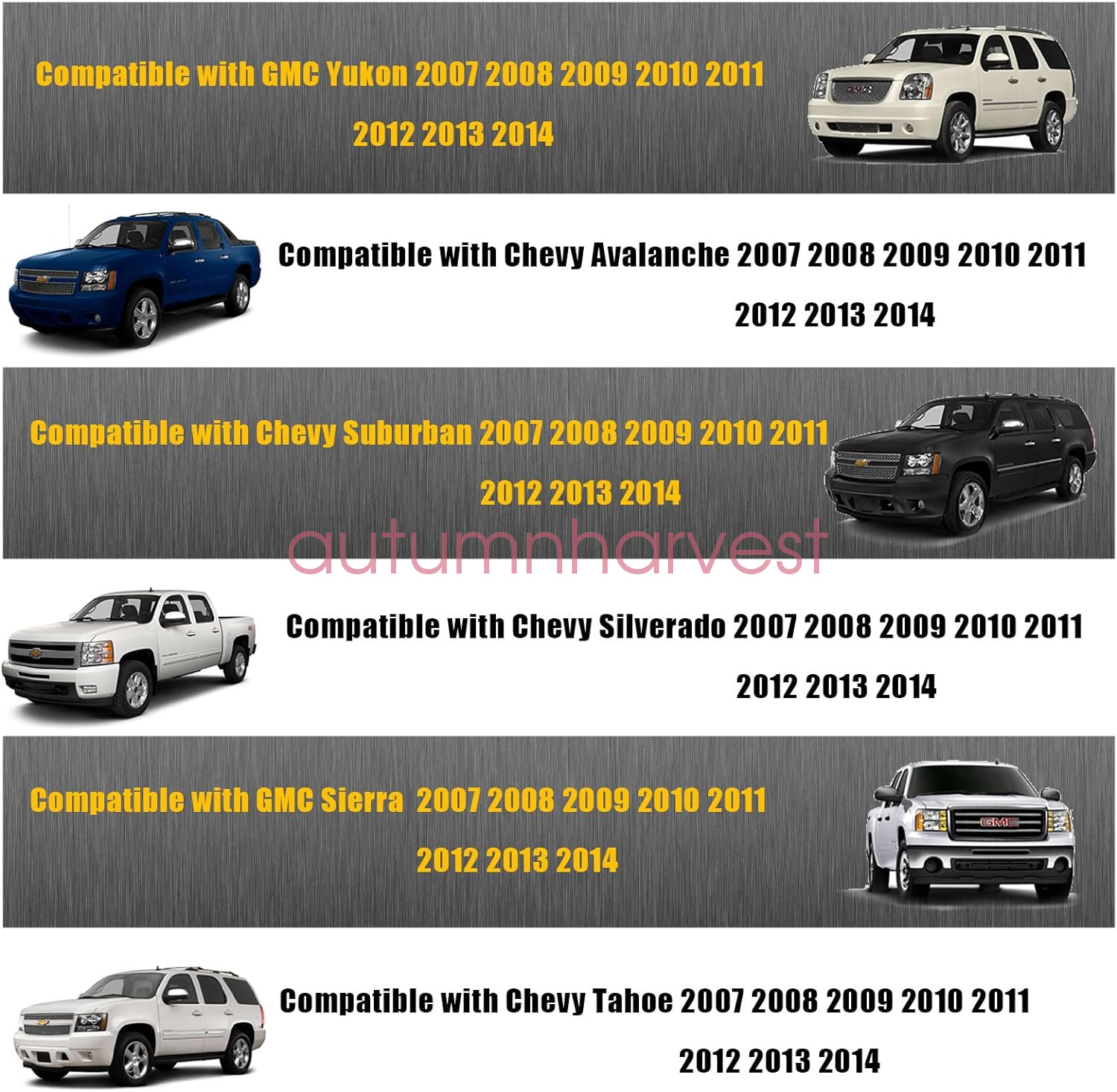 Make: Chevy, GMC Silverado, Sierra, Tahoe, Suburban, Avalanche, Yukon