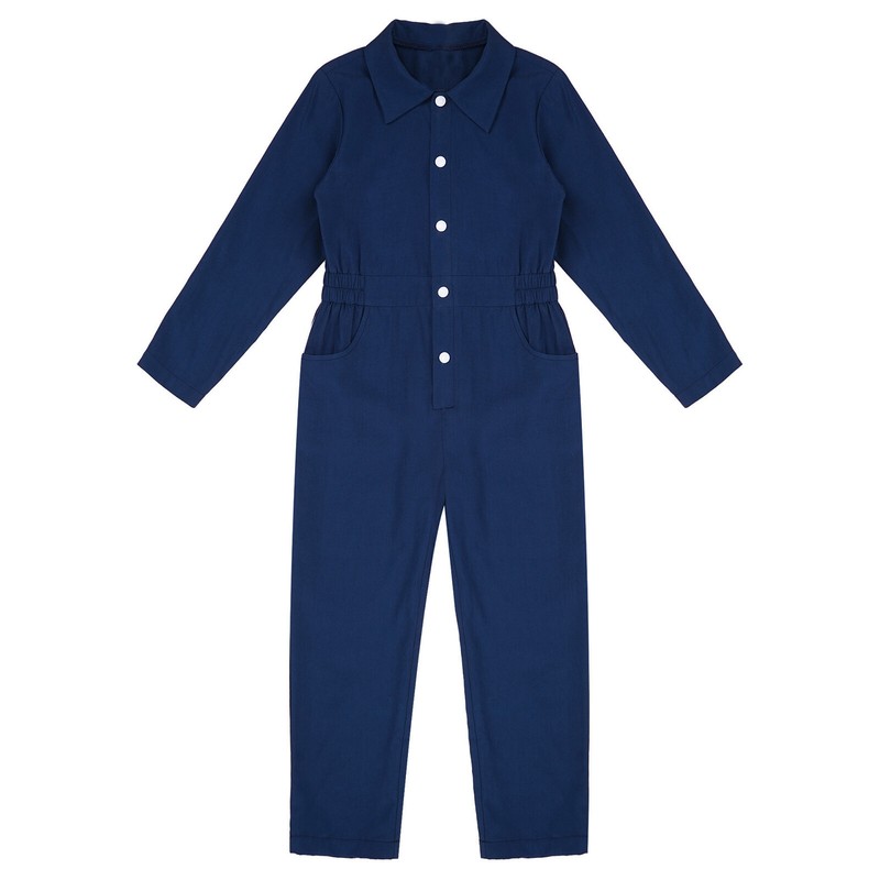The jumpsuit with long sleeves and turndown collar, simple solid color design.