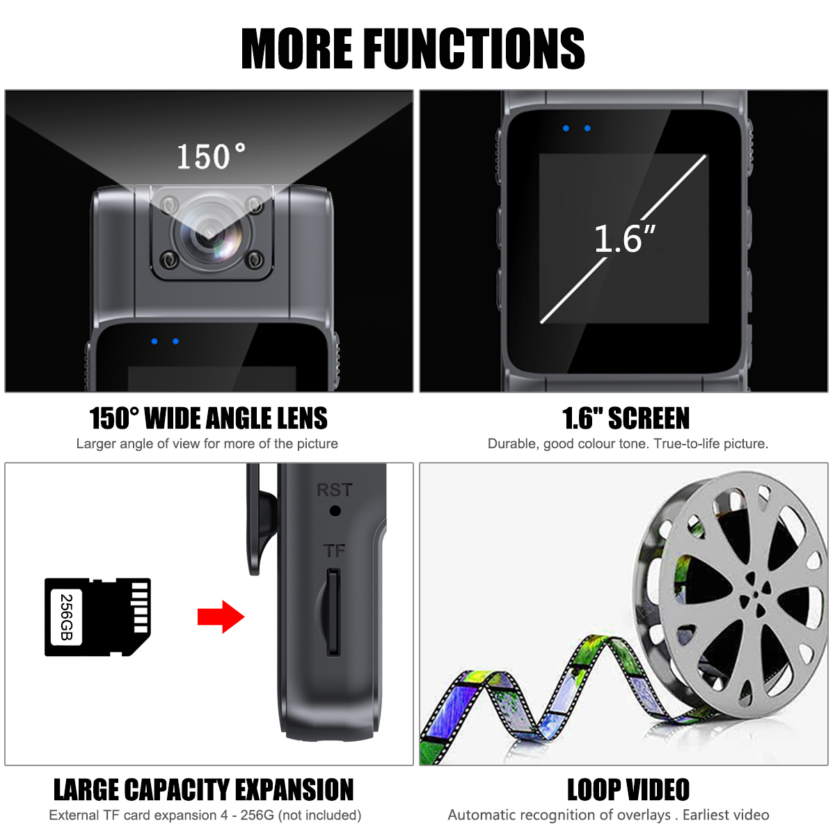 -- 150 ° wide angle: the use of wide-angle lens, viewing angle of 150 °, the movement of a larger shooting range. Can be used as a car recorder;