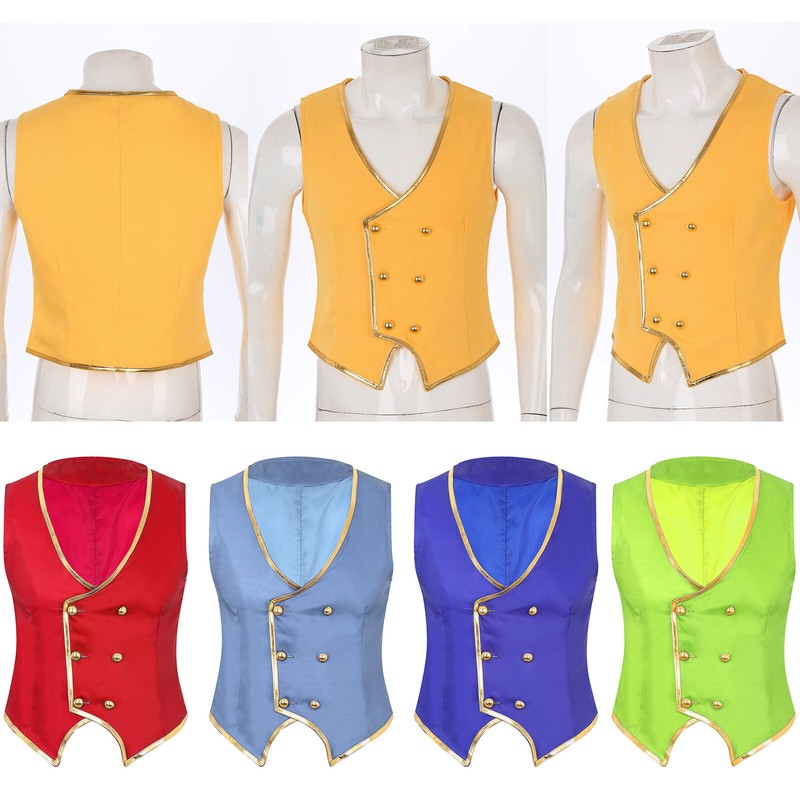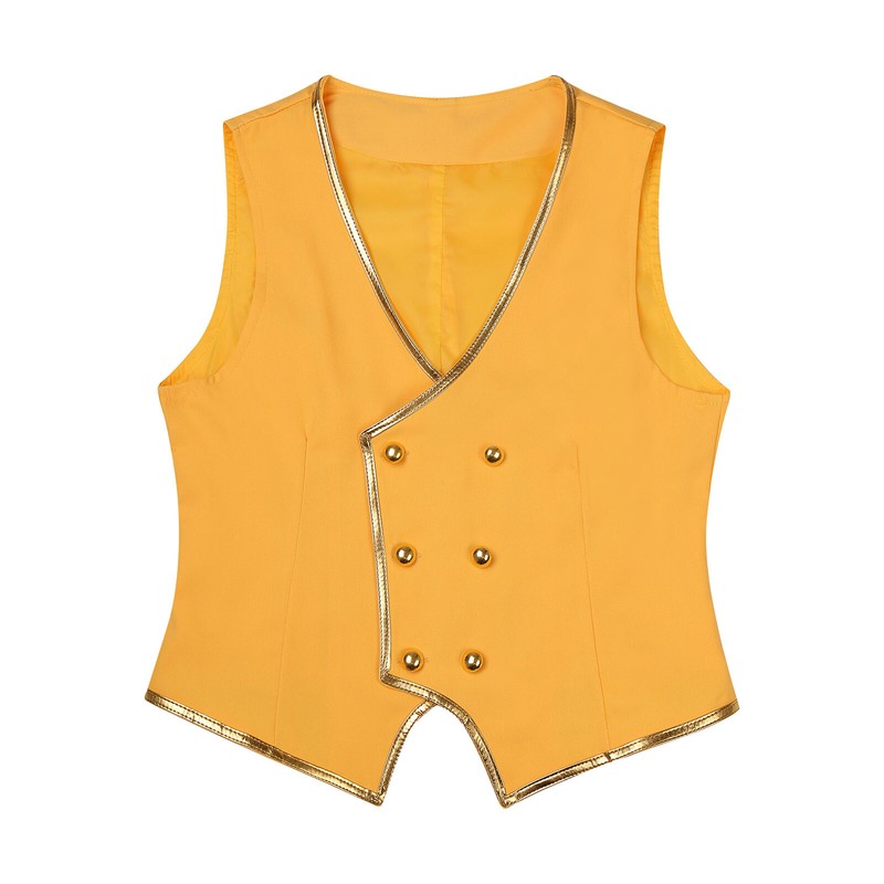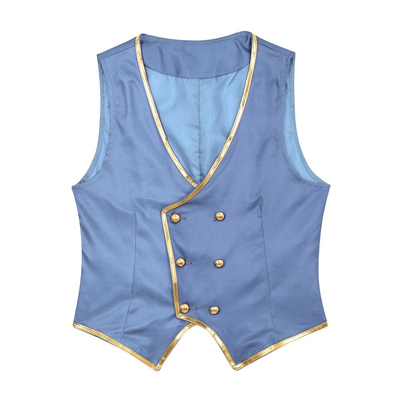Designed with v neck, double-breasted, hemispheric buttons, gold trims, pointed hem and fully lining, a perfect waistcoat.