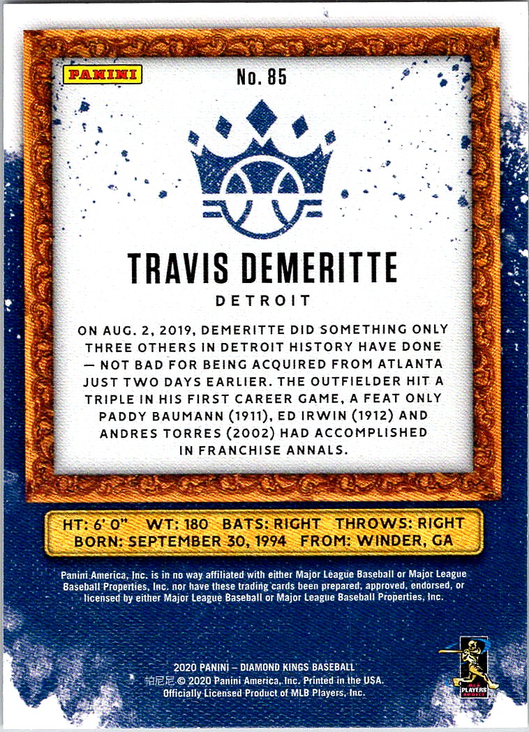 | Description: | Travis Demeritte | | Category: | Baseball | | Year: | 2020 | | Product: | Panini Diamond Kings | | Team: | Detroit Tigers | | Card Number: | 85 | | Rookie: | Yes | | Dimensions: | 3¼" x 2¼" |