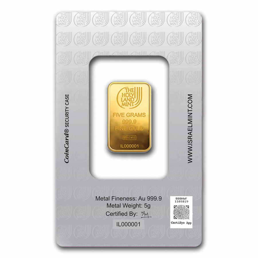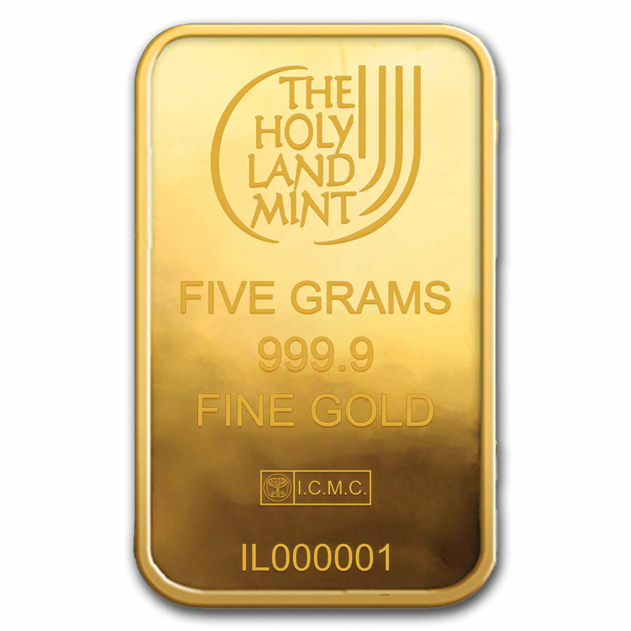 The BarThese Gold bars depict a dove, the symbol of peace and purity, in flight over the skyline of Jerusalem, which means City of Peace in Hebrew. The reverse is struck with The Holy Land Mint's name and logo with 5 GRAMS 999.9 FINE Gold and the unique serial number of each bar below.