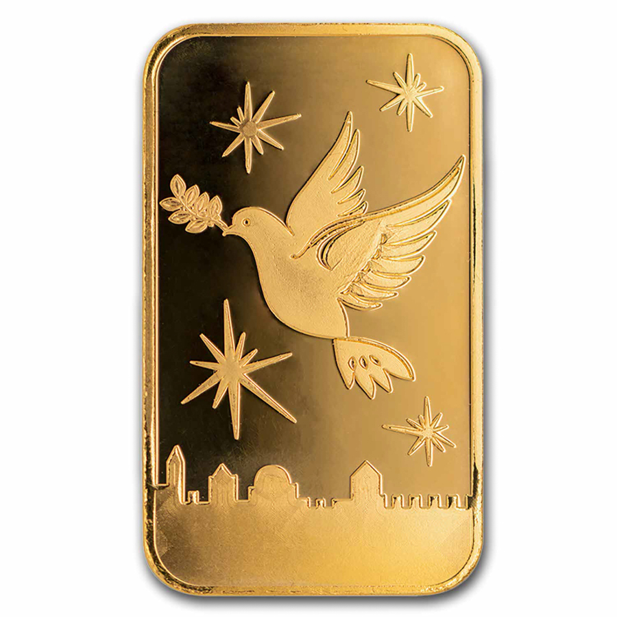 The simple yet striking design is a popular way to add Gold bullion bars to any investment portfolio. Add this Holy Land Mint Dove of Peace Gold bar to your cart today!