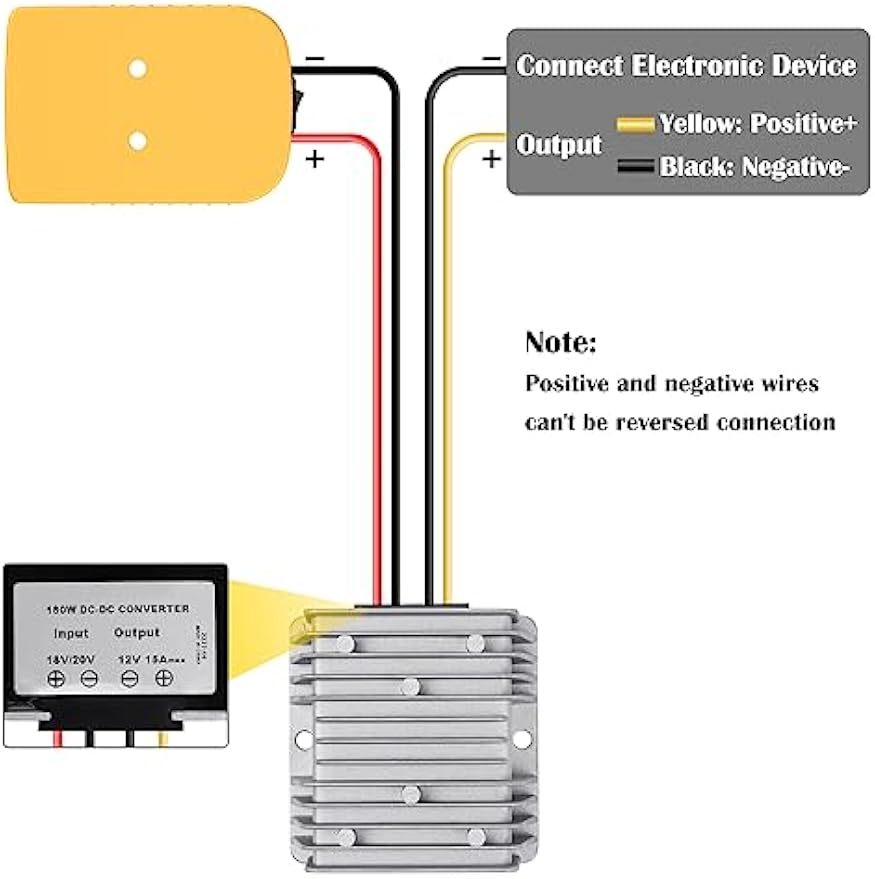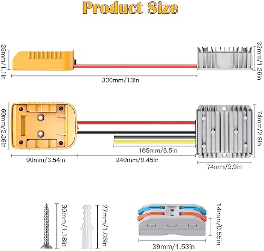 Step down converter compatible with Dewalt 20V /18V DCB series Li-ion batteries, work with for DCB205 DCB206 DCB204 DCB203 DCB200 DCB201 etc. Power adapter connector is well-made, snug fit your battery, can install and lock battery easily.